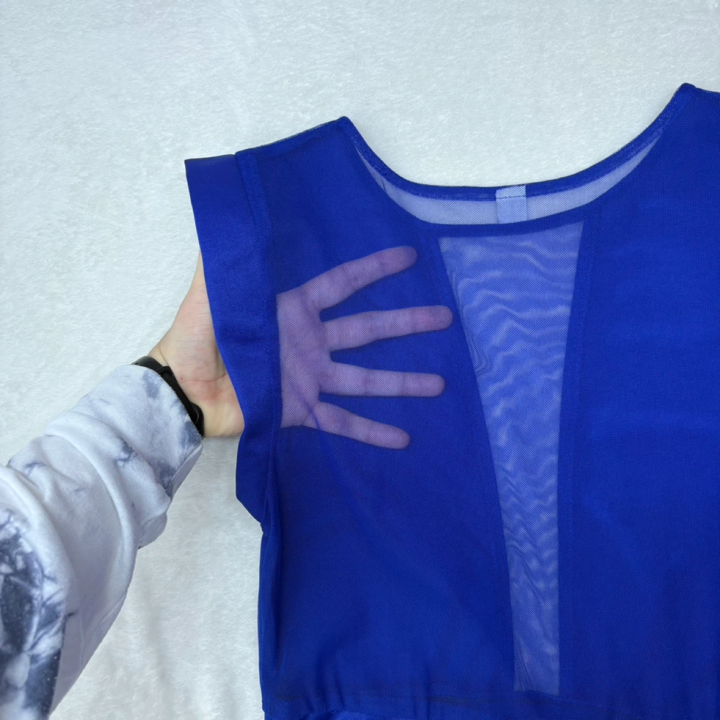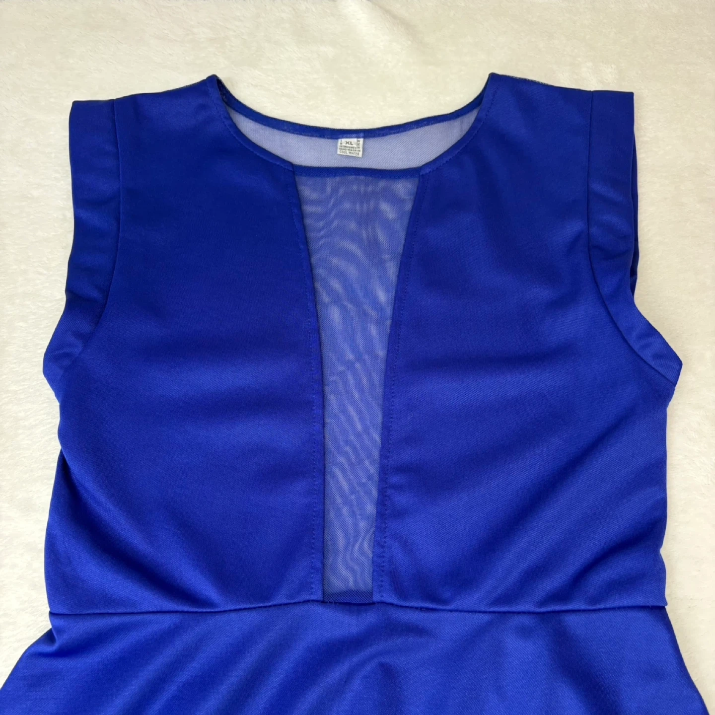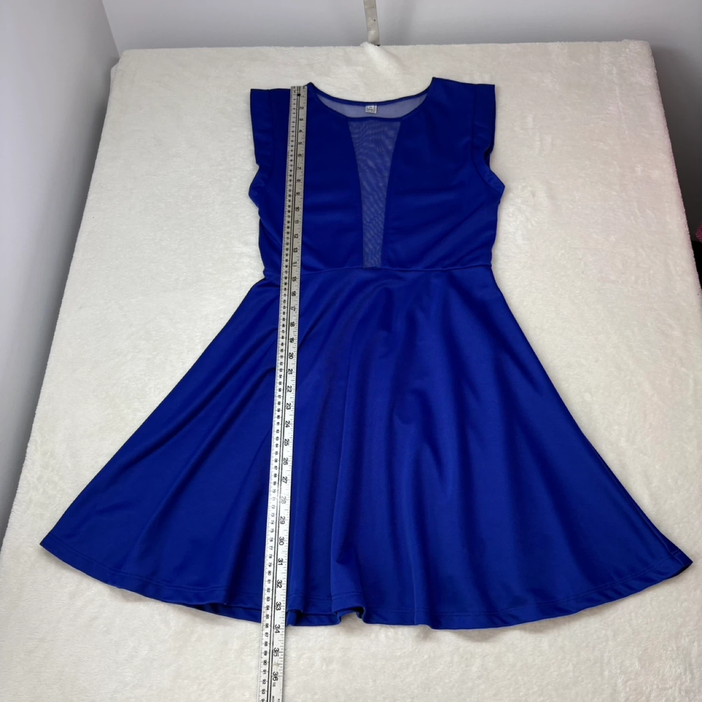 This vibrant royal blue dress features a striking sheer mesh deep V-panel at the front and a fully sheer mesh back. Designed with a sleeveless fit-and-flare silhouette, it offers a bold look for parties or evening events. Despite the XL tag, the measurements indicate a much smaller fit.