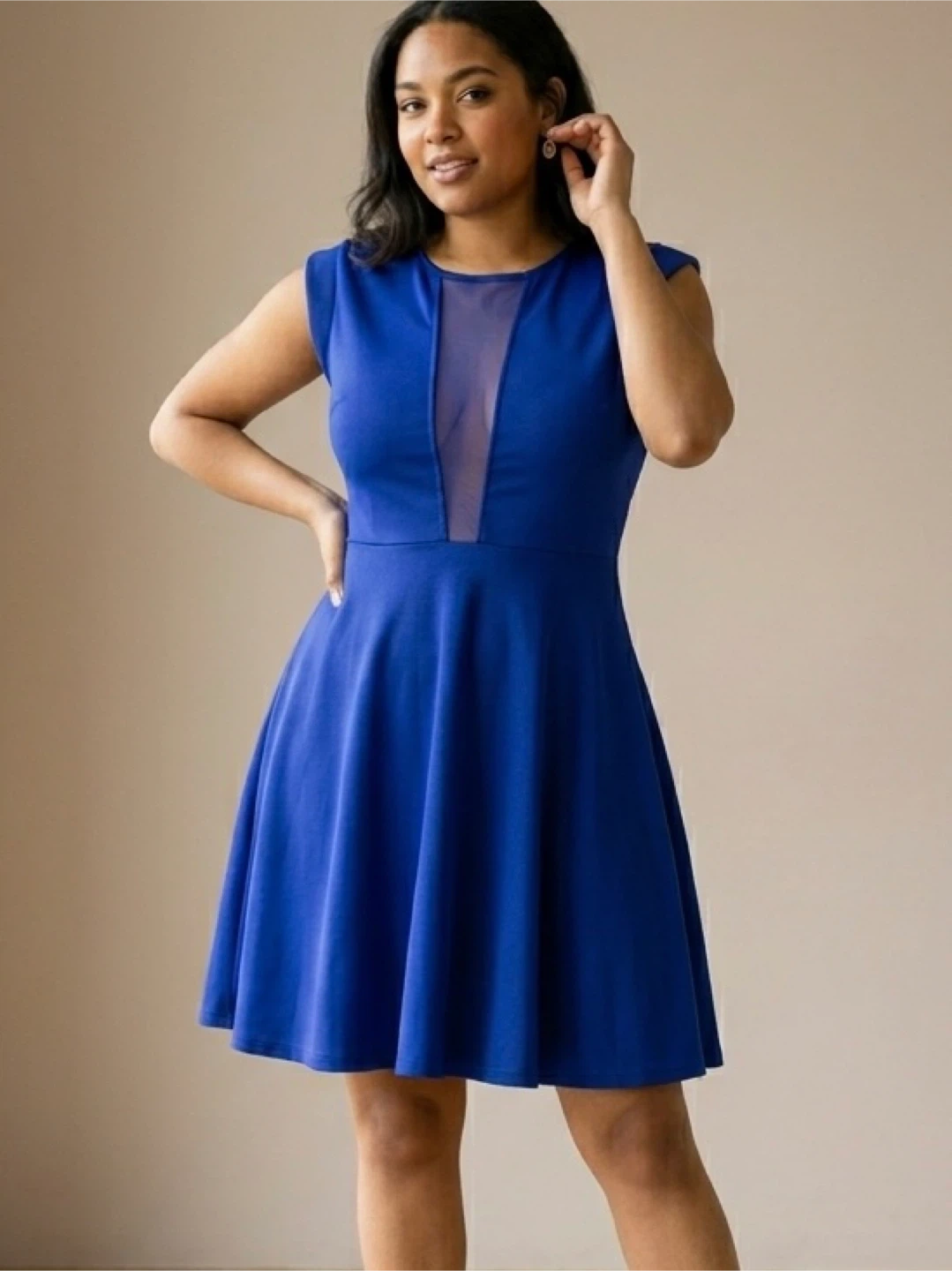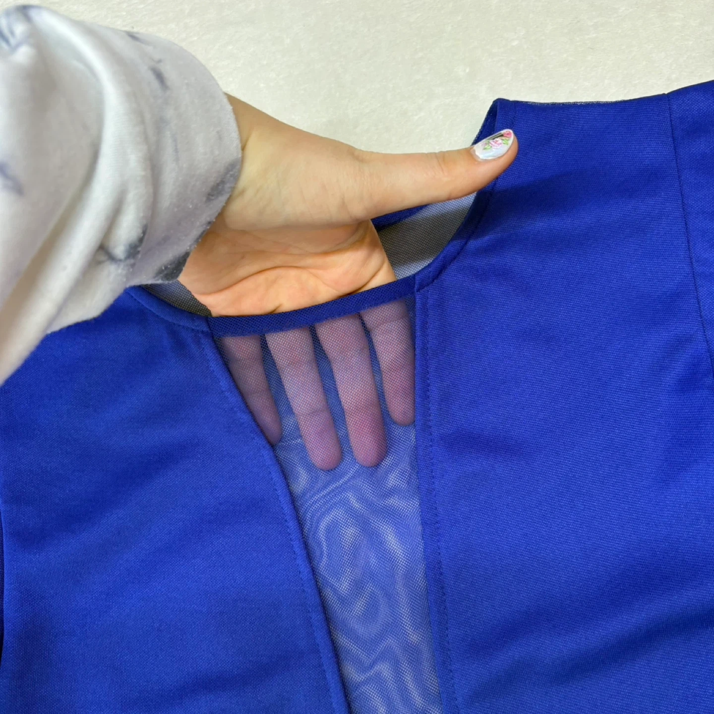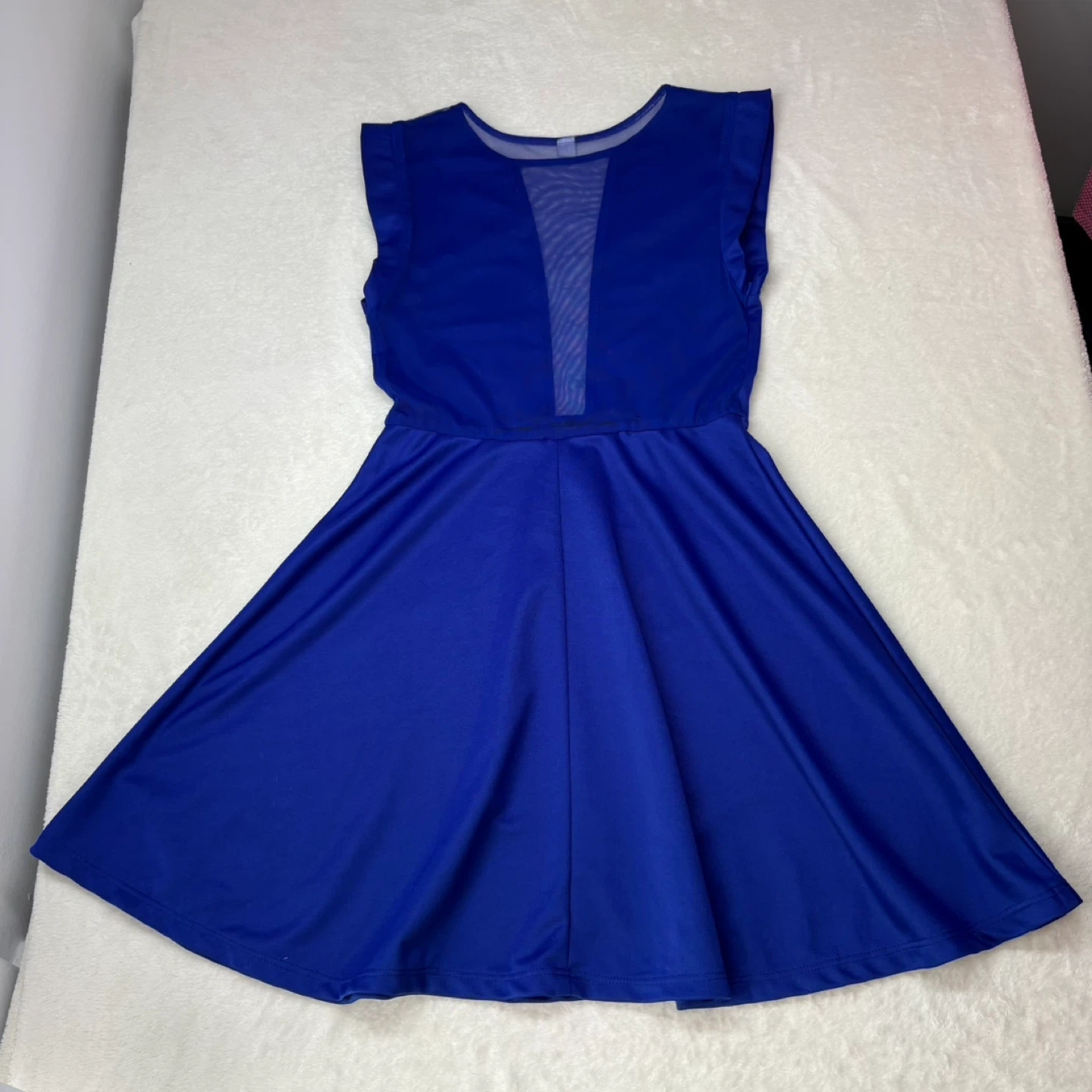 This vibrant royal blue dress features a striking sheer mesh deep V-panel at the front and a fully sheer mesh back. Designed with a sleeveless fit-and-flare silhouette, it offers a bold look for parties or evening events. Despite the XL tag, the measurements indicate a much smaller fit.