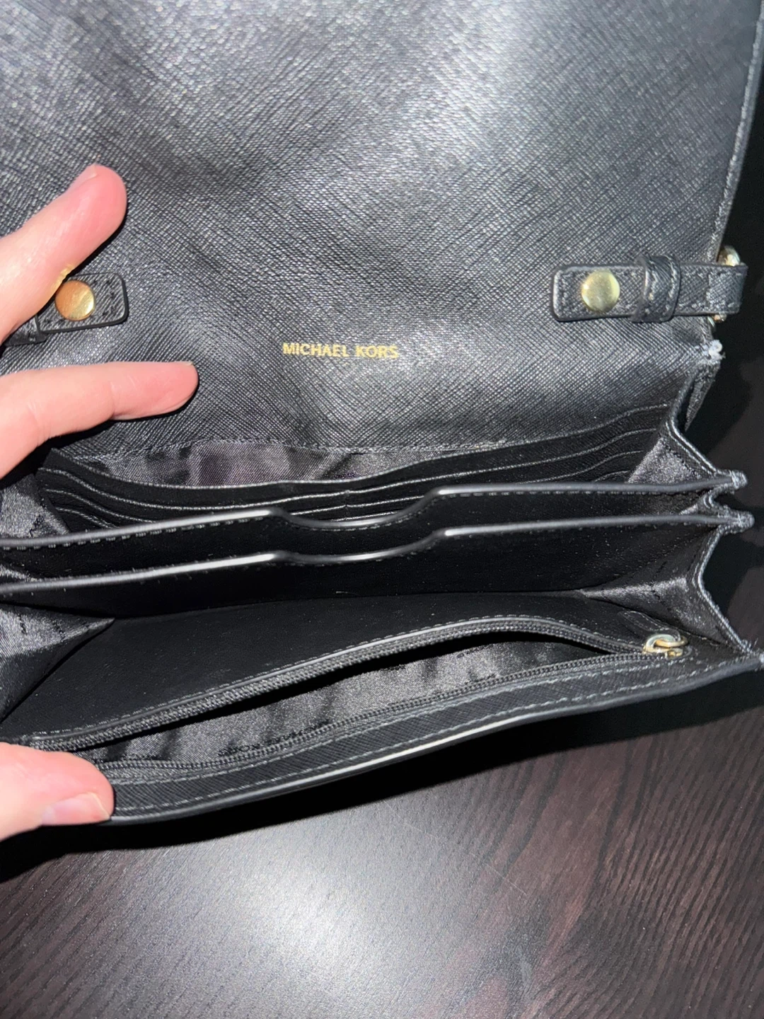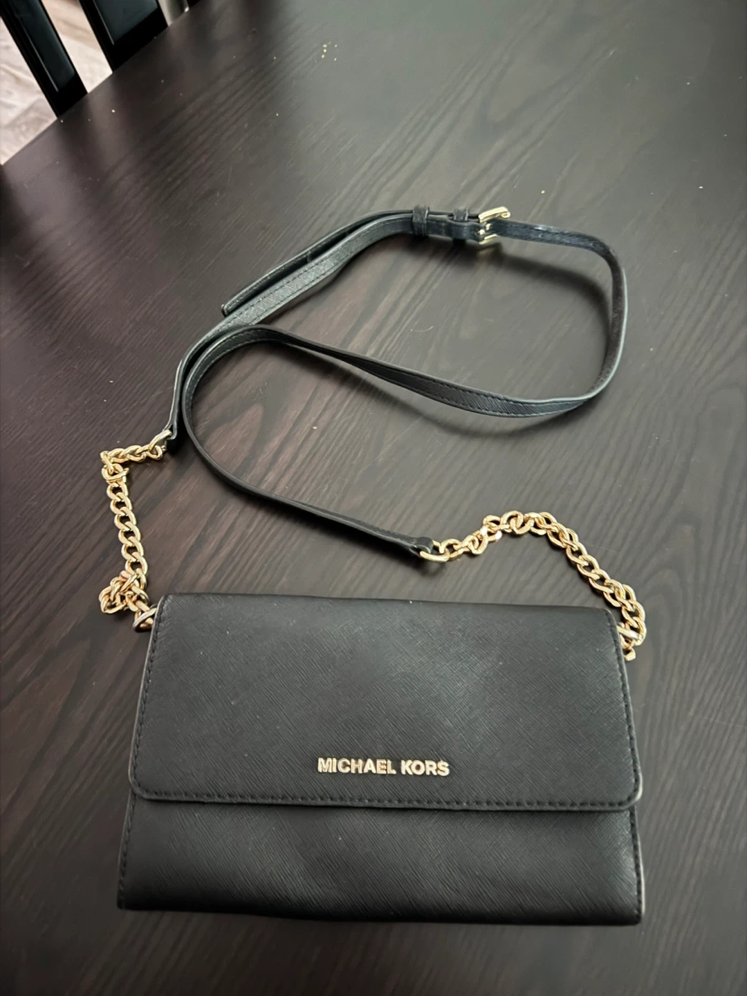 This black Michael Kors wallet on a chain is crafted from durable Saffiano leather. It features multiple card slots and a zippered compartment inside.