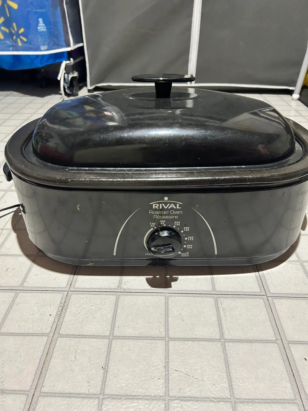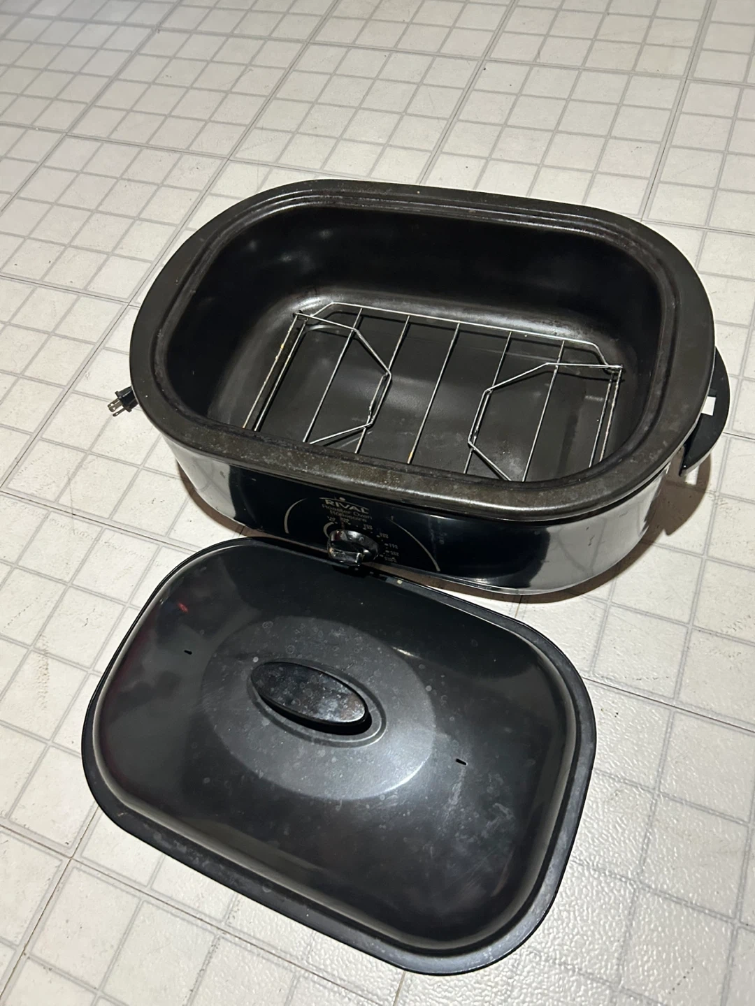 This is a black Rival Roaster Oven. It includes the oven insert, rack, and lid. The temperature dial goes from warm up to 425°F.