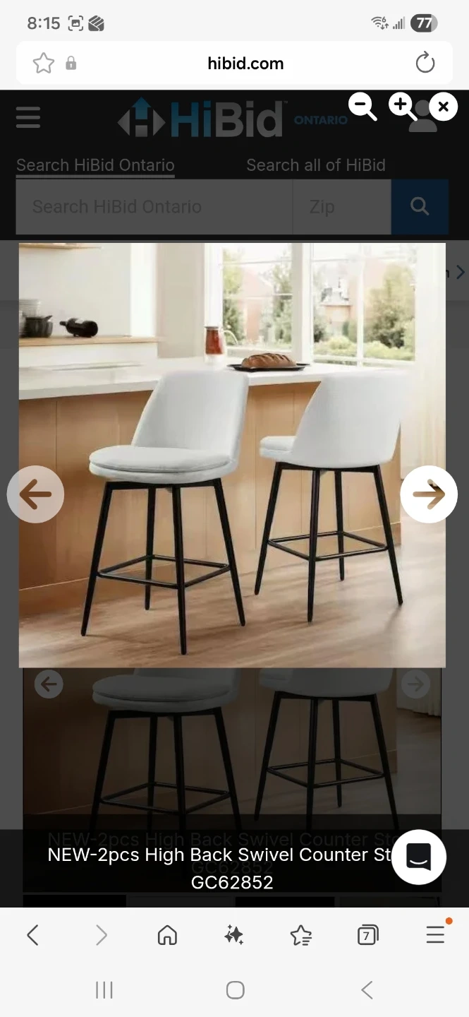 This is a set of two Spruce & Spring Cecily counter stools. They have a 27-inch seat height, high backs, and swivel functionality. The seats are upholstered in white with black metal legs.