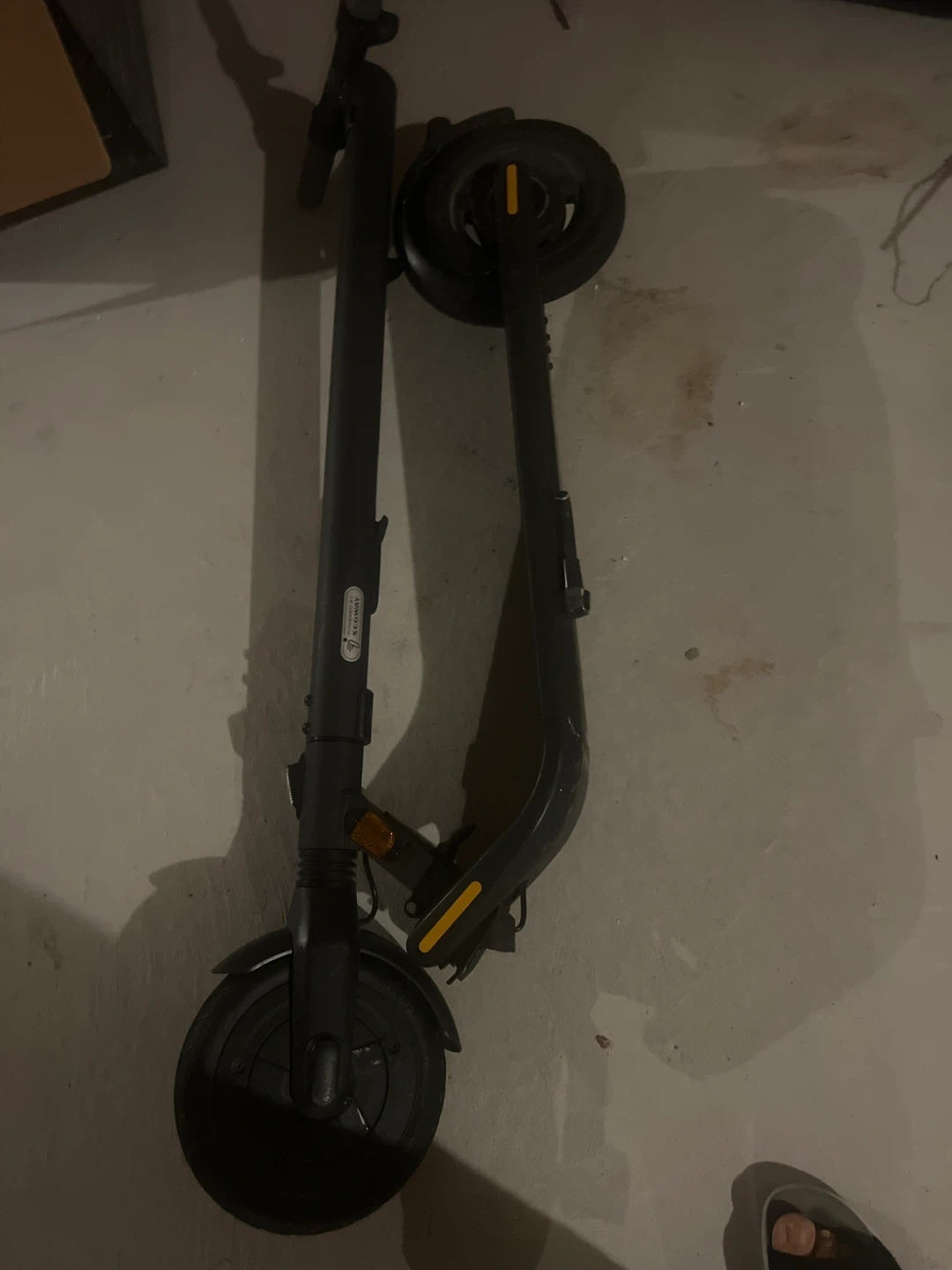 This is a Ninebot electric kickscooter. It's black and foldable for easy storage and transport. It has a built-in light for visibility. This scooter is great for getting around town!