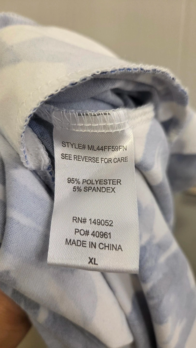 This Fashion Nova maxi dress features a blue and white floral print. It's made from 95% polyester and 5% spandex. The dress has thin spaghetti straps and a V-neckline with pockets. It's an XL size.