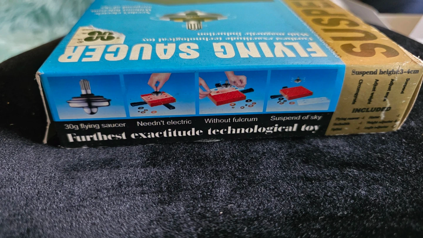 This is a Suspend Flying Saucer, a technological toy with magnetic induction. It doesn't need electricity and can suspend in the air without fulcrum. Includes original box. The toy comes with a magnetic field center and balance. Adjusting the weight can help suspend the flying saucer.