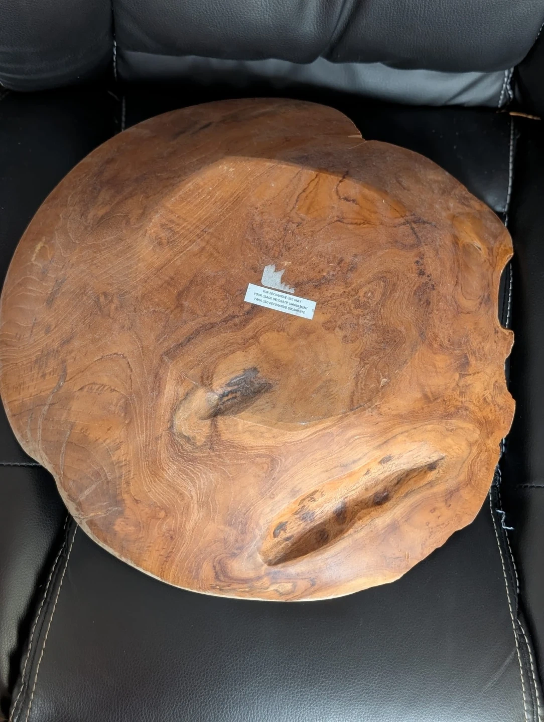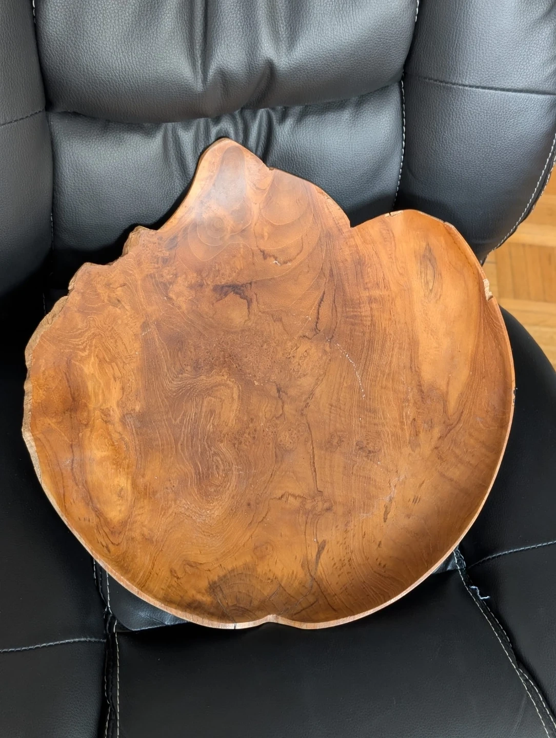 Beautiful, rustic wooden serving bowl. Natural wood grain and shape. Great for displaying fruit or as a centrepiece. Approx. 16 inches wide.
