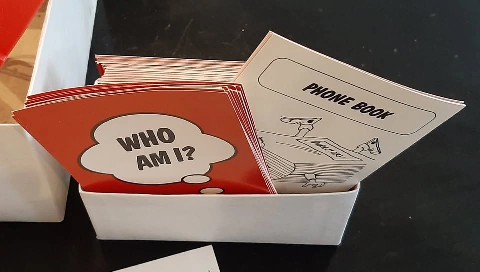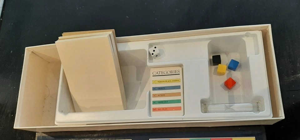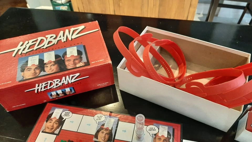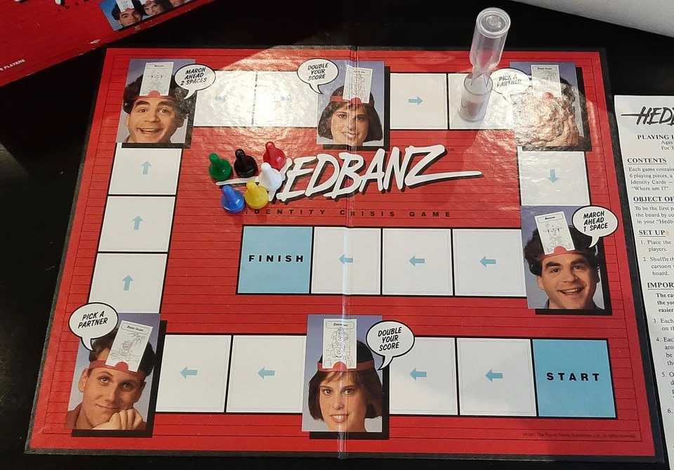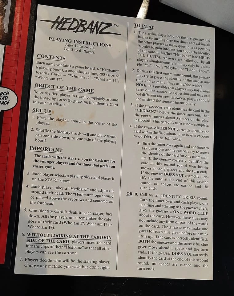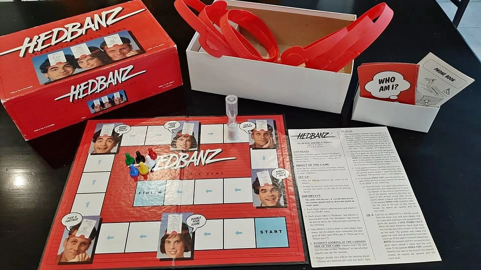 In this game each player wears a headband that holds a card for everyone else to see but herself or himself. The card has a picture of an animal, food, or some other object. During a player's turn, he or she asks the other players questions about what is on the card to learn what is written on it.