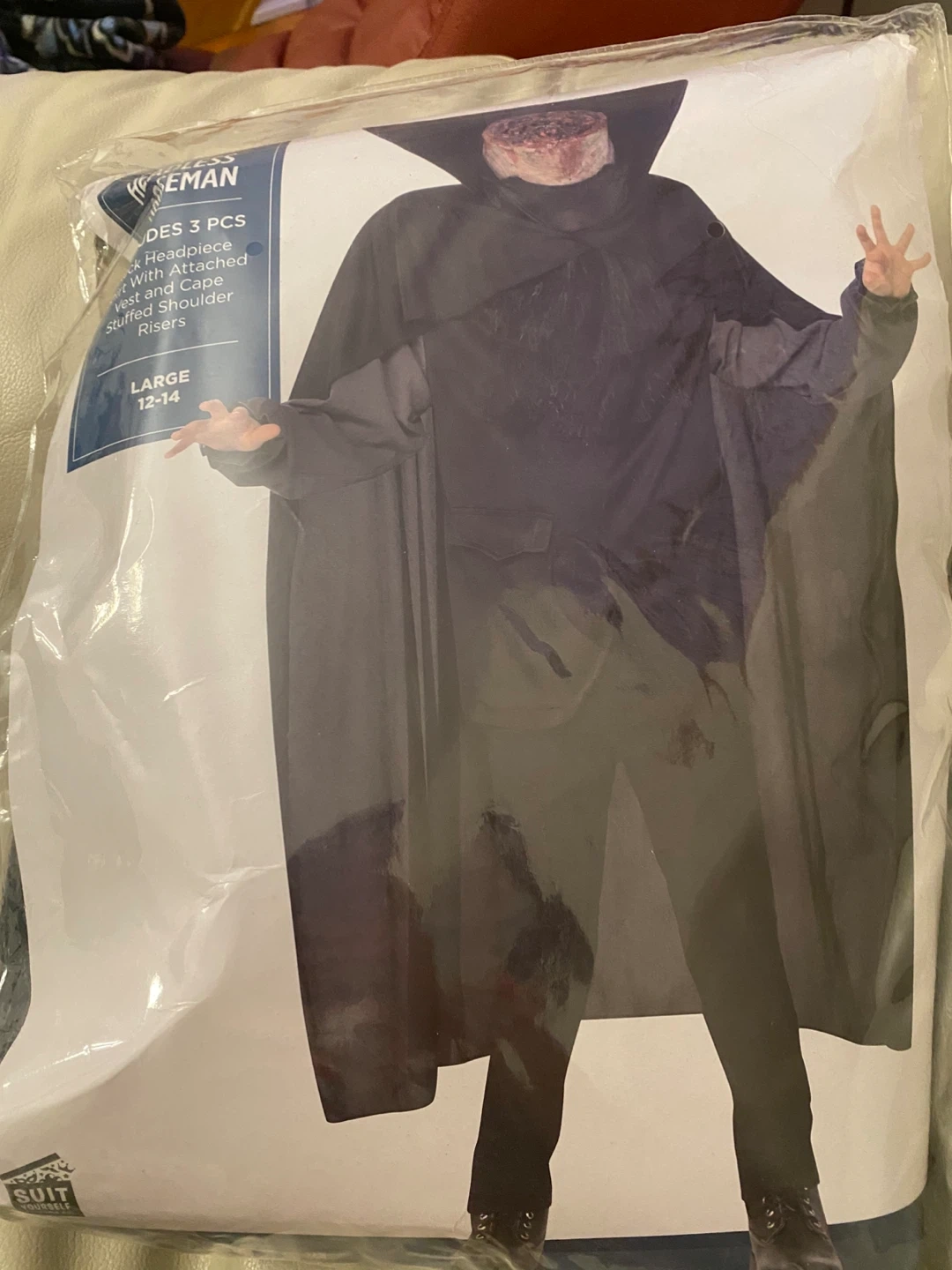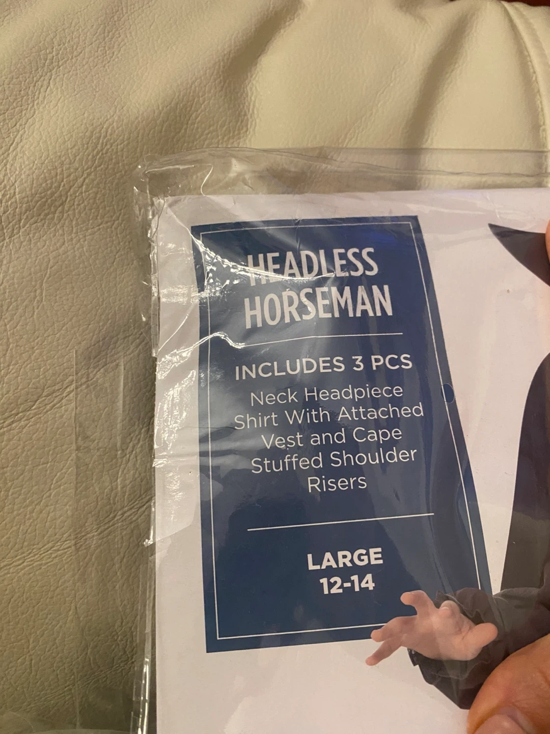 81Get ready for Halloween with this Headless Horseman costume! It's a size Large (12-14) and includes 3 pieces: a neck headpiece, a shirt with an attached vest and cape, and stuffed shoulder risers