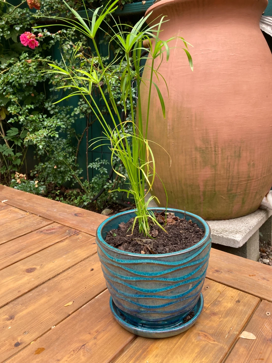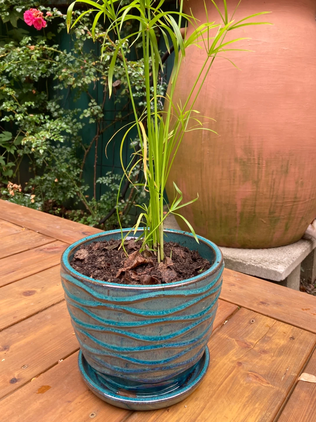 Selling a healthy papyrus plant in a teal coloured ceramic pot with built in drain pan. Cost covers price of planter, as shown in price tag in last pic. It's a beautiful plant that adds a touch of greenery to any space. The plant is well-cared for and ready to brighten up your home or office. These will eventually grow 2 feet tall, and then need repotting to a larger pot. They like wet feet—keep it well-watered. Please check out all my plant posts!🌿