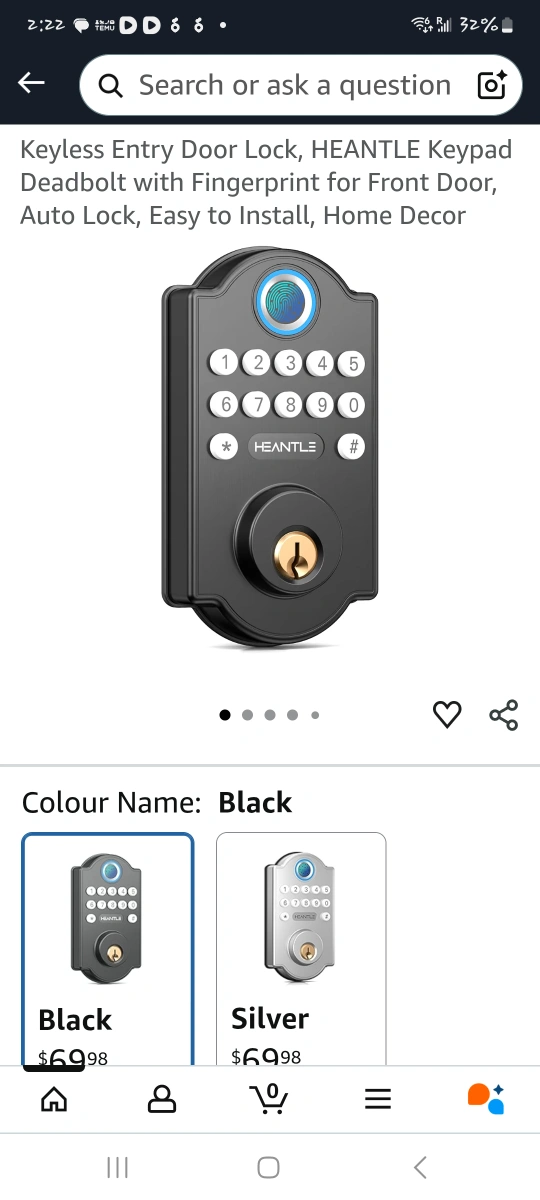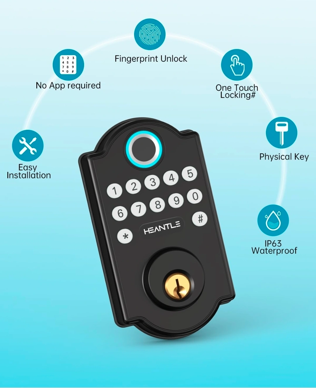 75Selling a HEANTLE keyless entry door lock in black. It's a keypad deadbolt with fingerprint access for your front door. Easy to install and adds a nice touch to home decor.