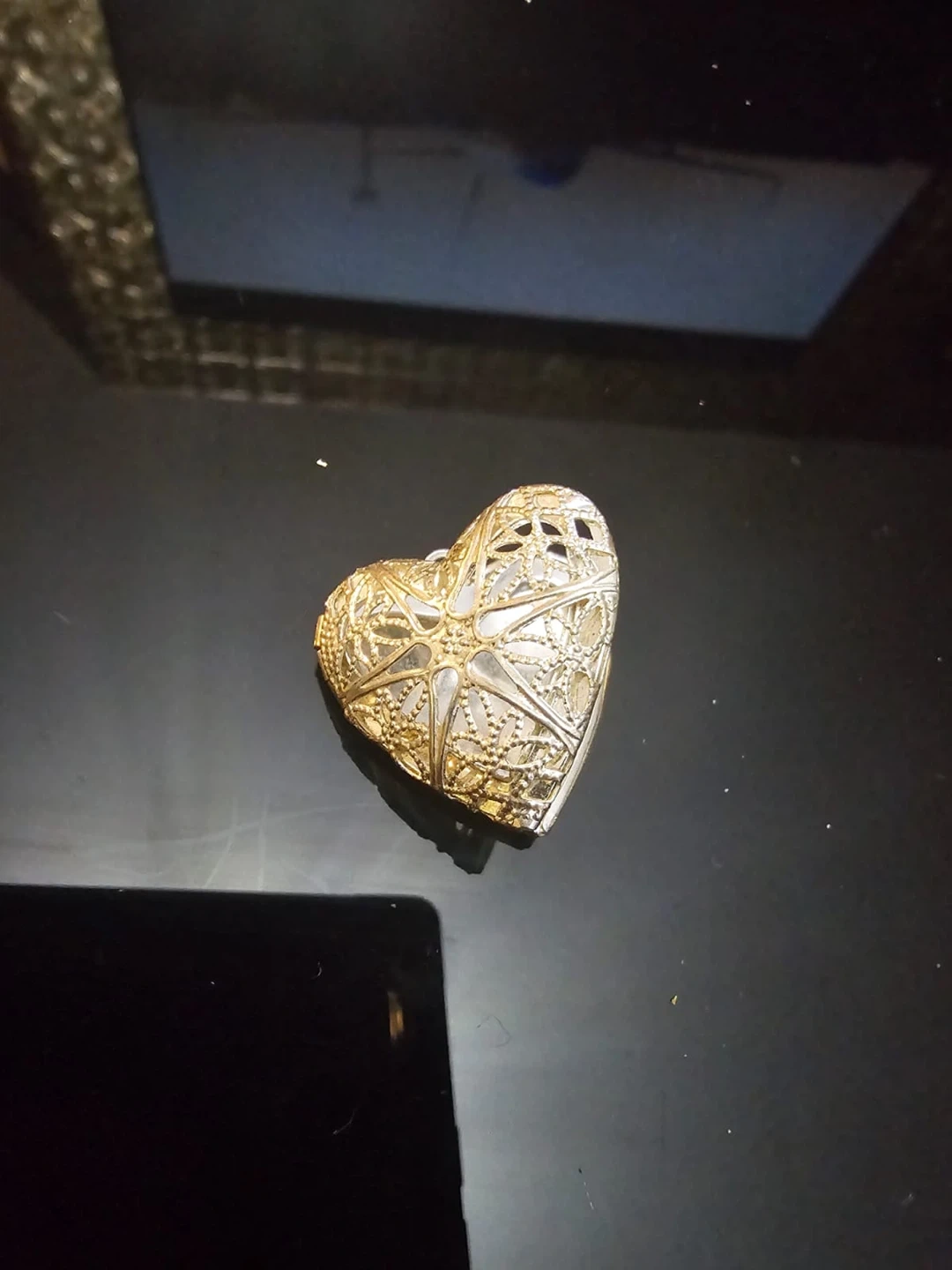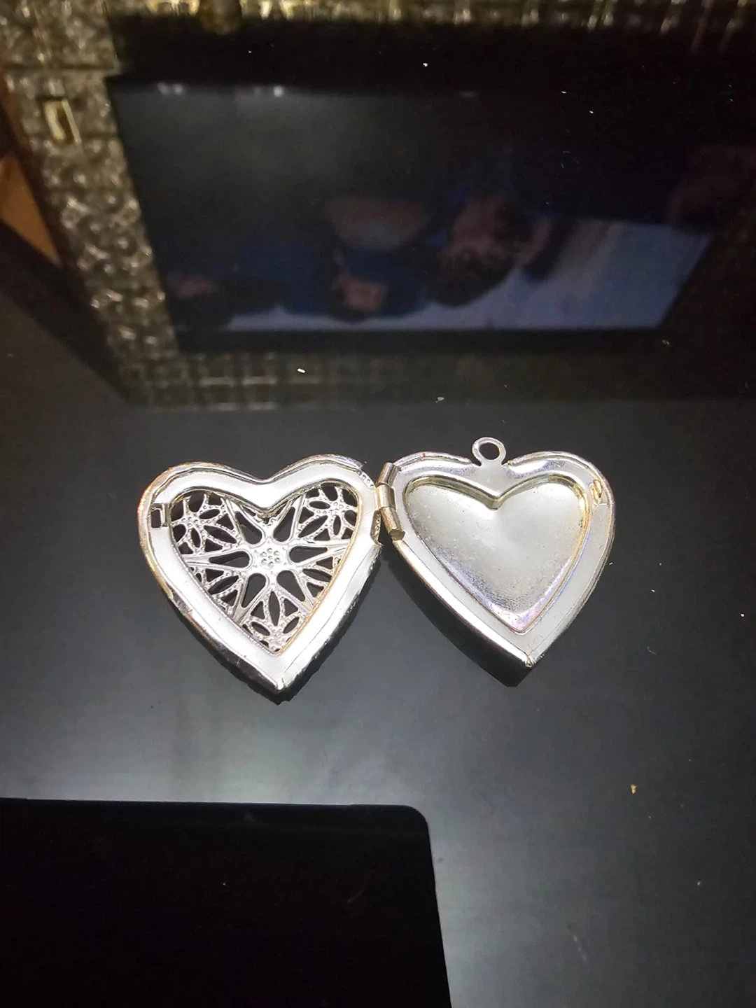 9Selling a heart-shaped locket. It's in great condition and ready for a new home! The locket has a detailed design on the front and opens to reveal space for two small photos or keepsakes