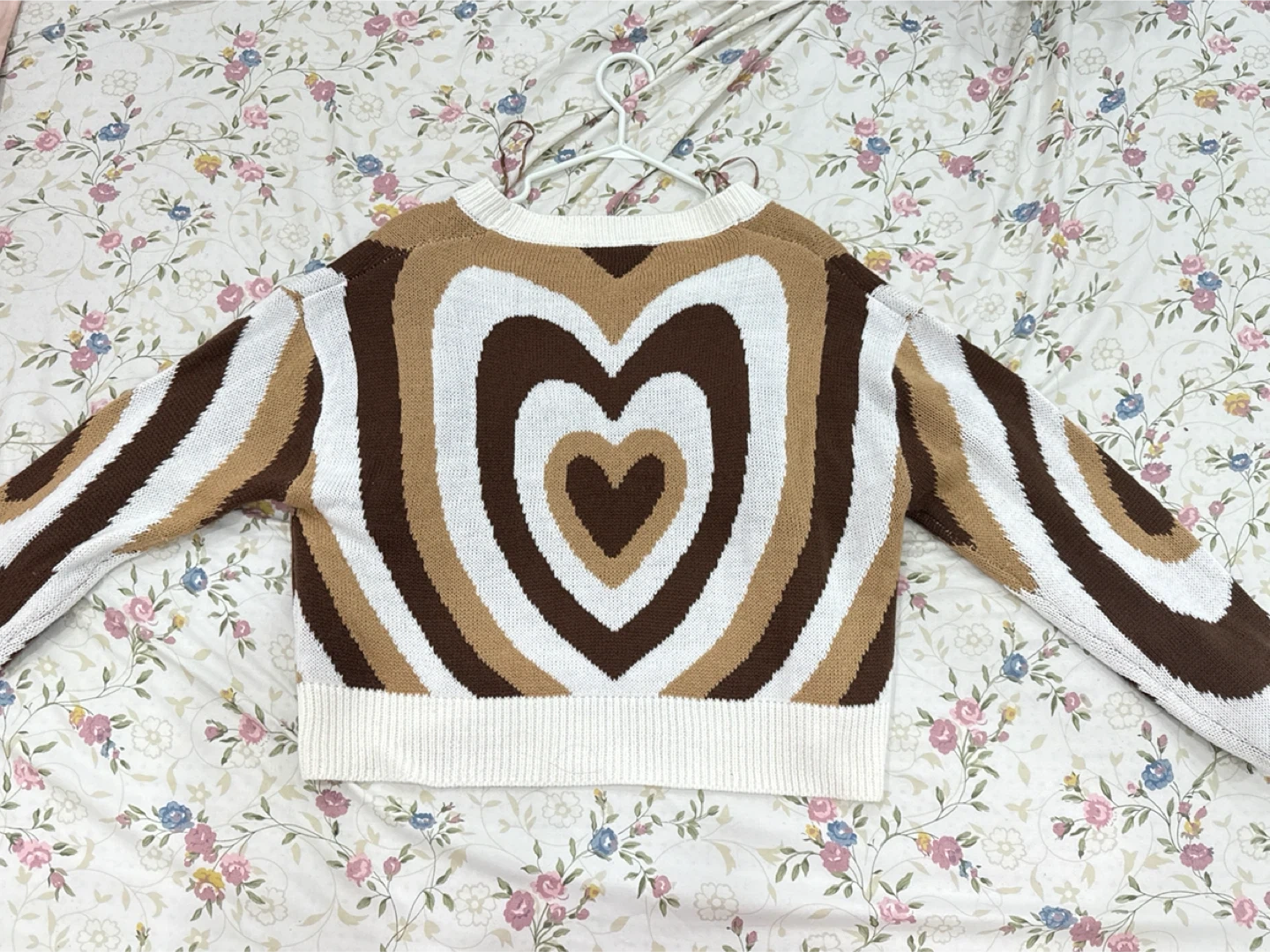 10Cozy knit sweater with a fun heart pattern in brown, tan, and white. Perfect for adding a touch of whimsy and fall to your wardrobe!