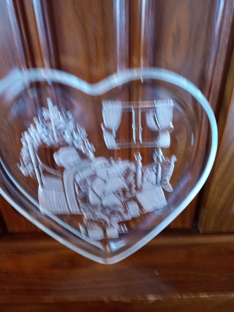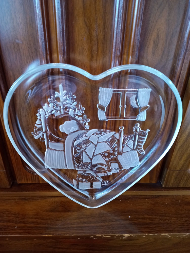 Selling a cute heart-shaped glass dish! It features an etched design of a Christmas bedroom scene, complete with a bed, window, and bedside decorations. Perfect for adding a touch of charm to your home decor.