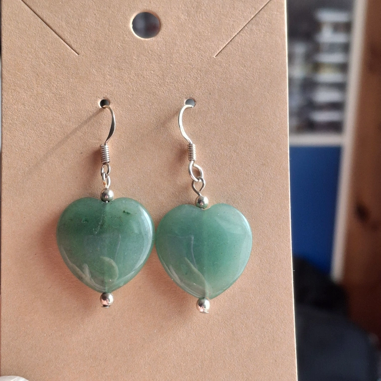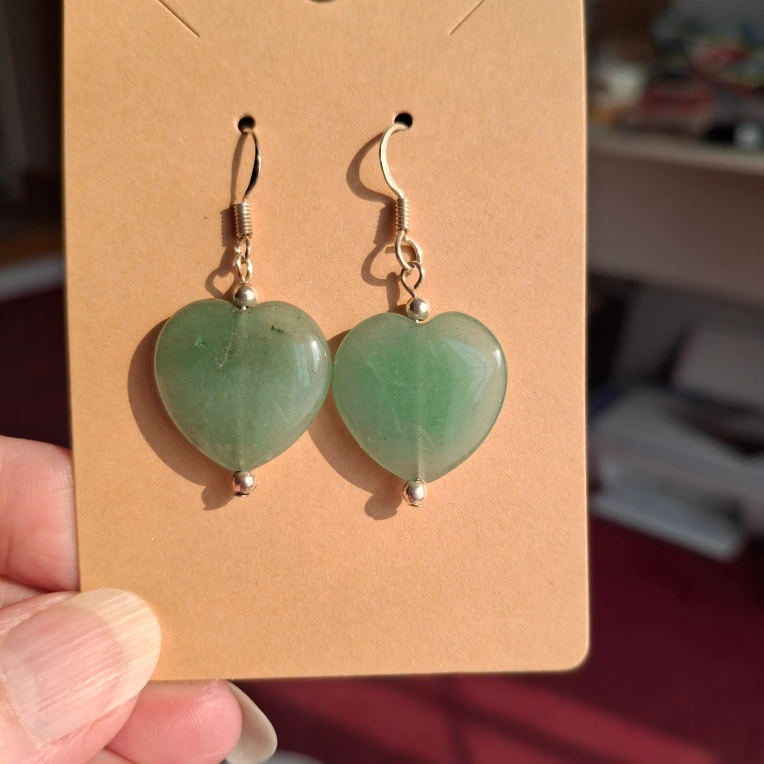 These are a pair of heart-shaped earrings made of green aventurine. Sterling silver.