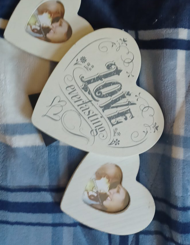 Selling a few heart-shaped picture frames! They have a sweet 'Love Everlasting' design on one of them. Perfect for displaying cherished memories