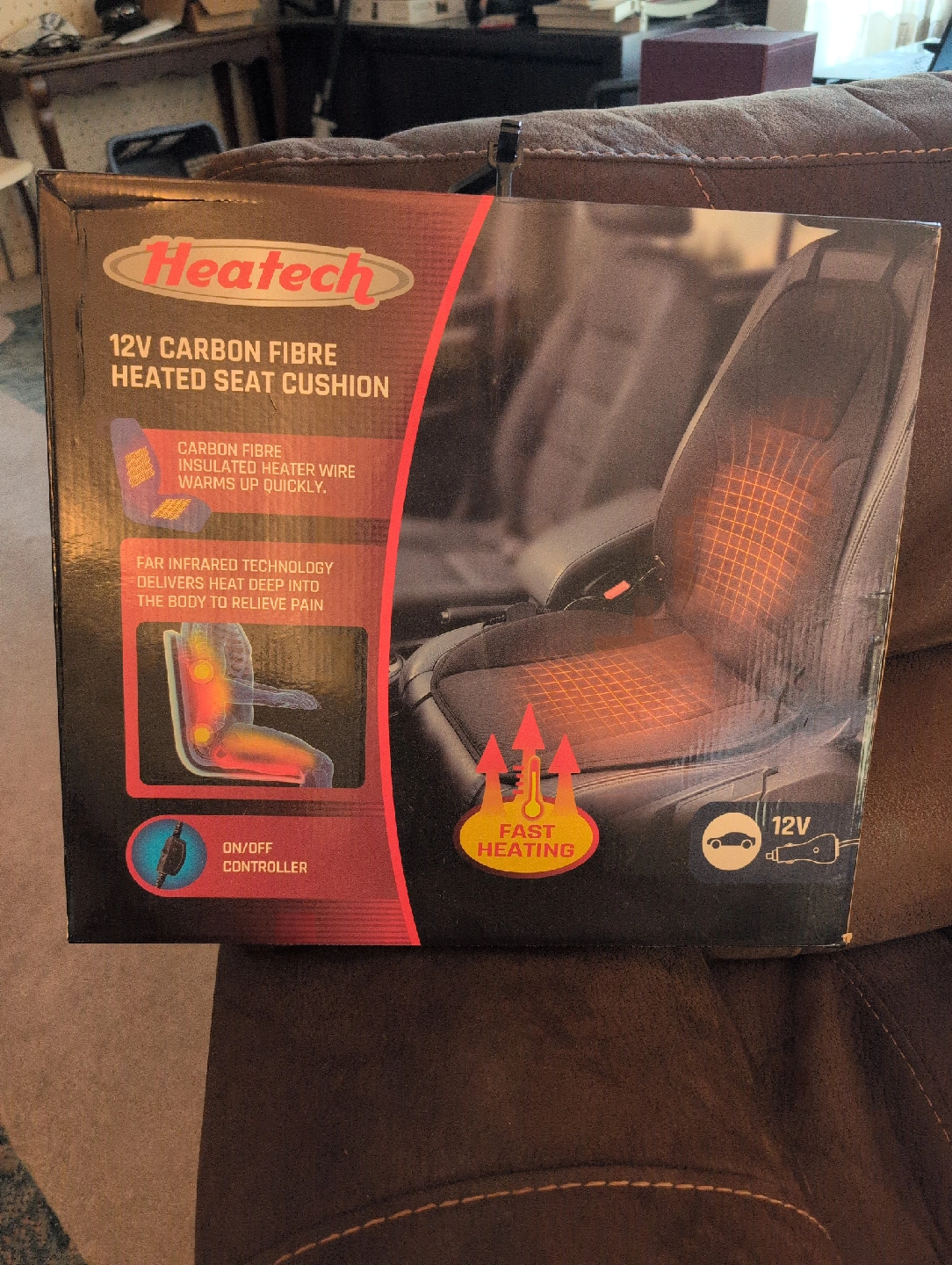10Selling a brand new Heatech 12V carbon fibre heated seat cushion! It features carbon fibre insulated heater wire that warms up quickly, and far infrared technology delivers heat deep into the body to relieve pain. It also has an on/off controller and fast heating