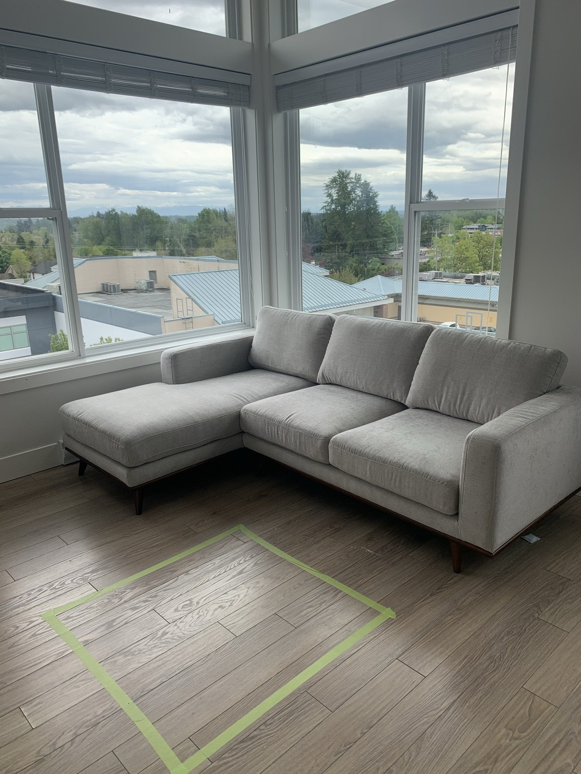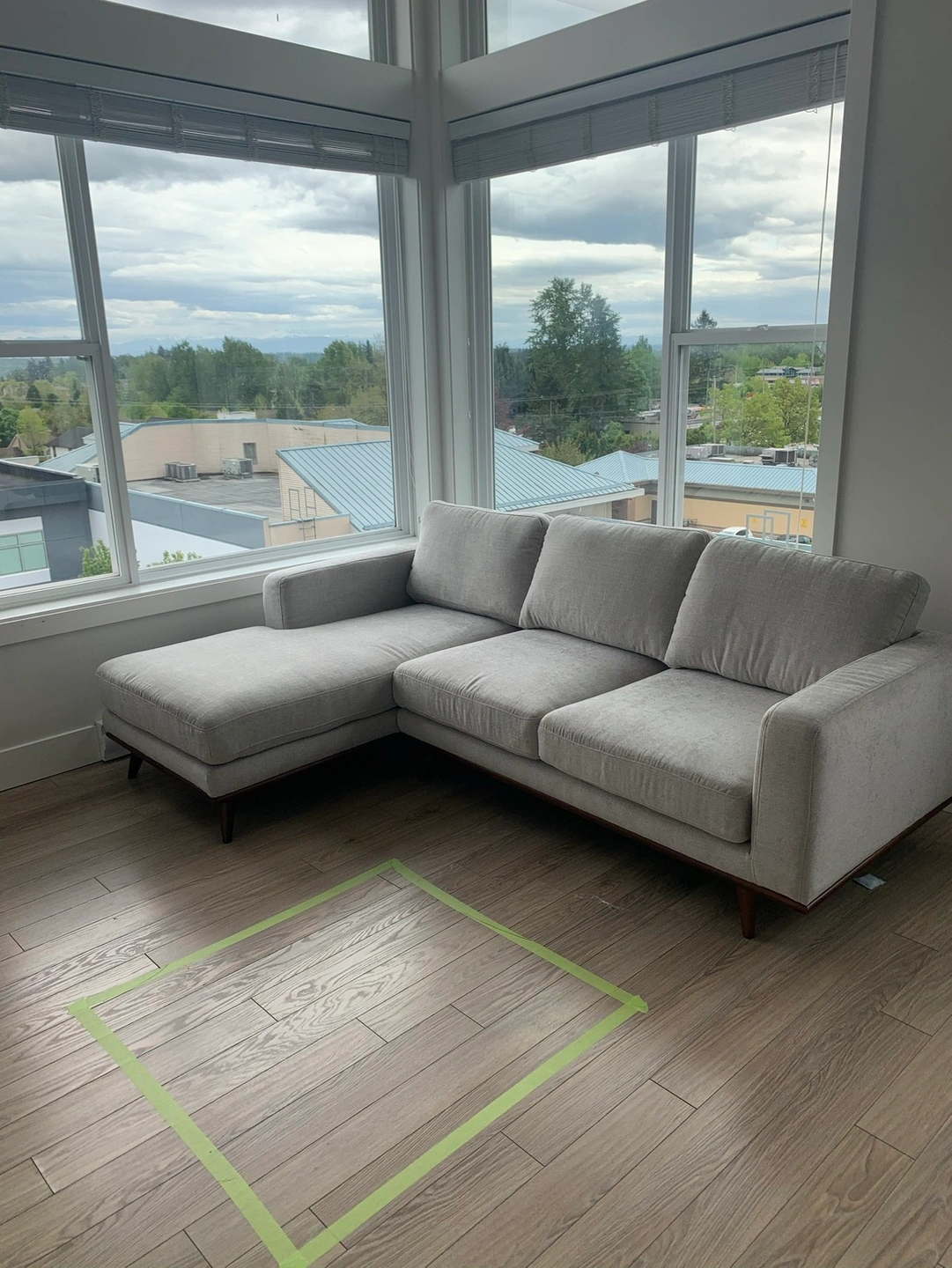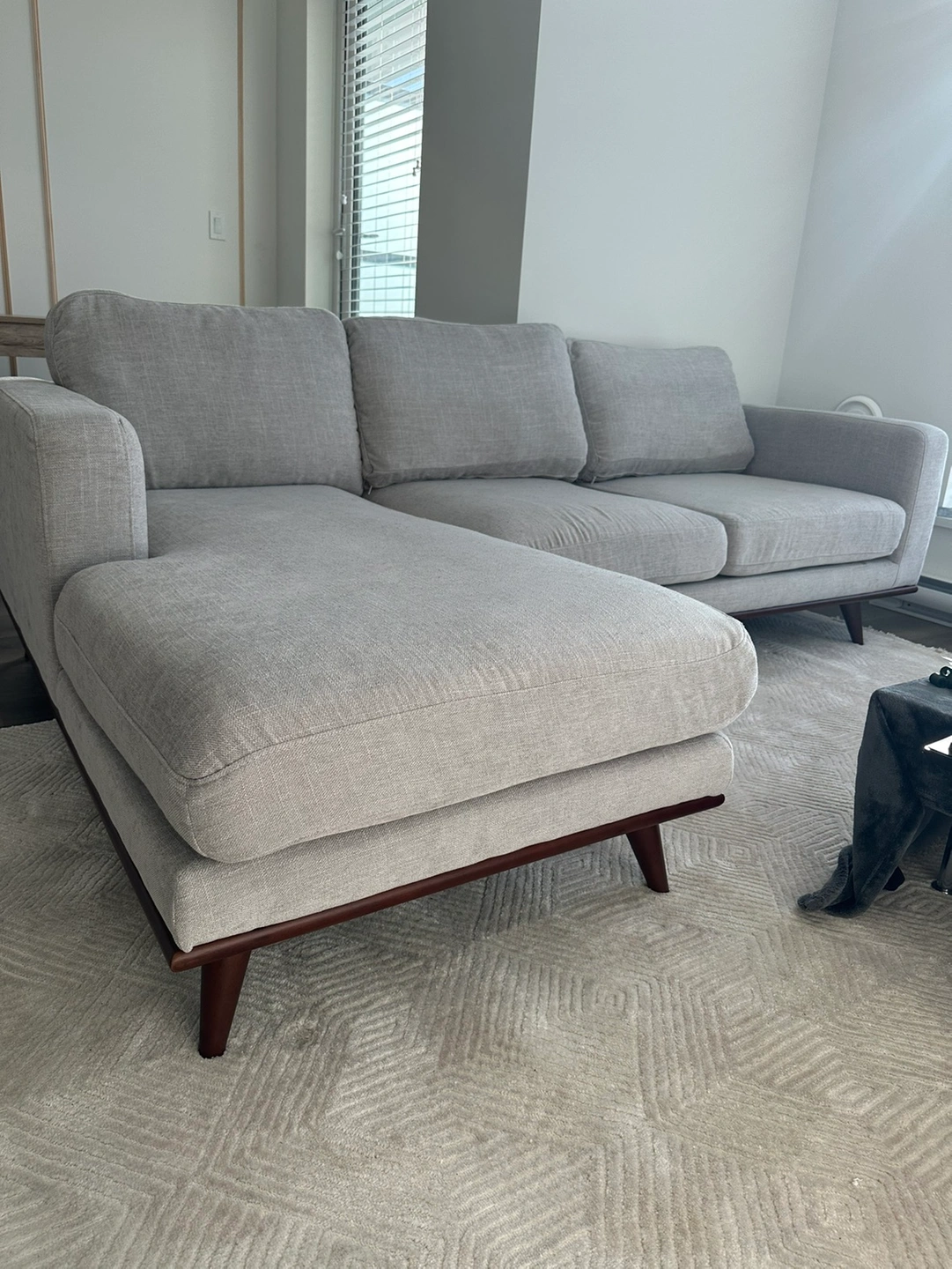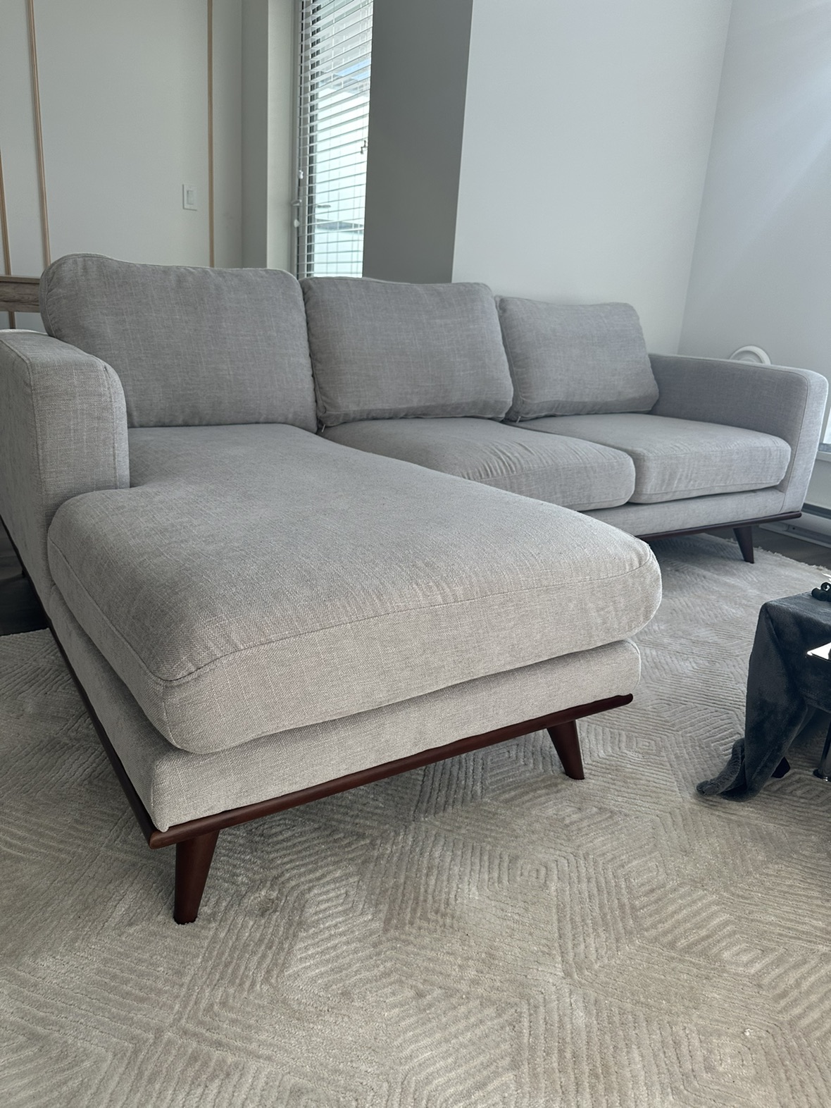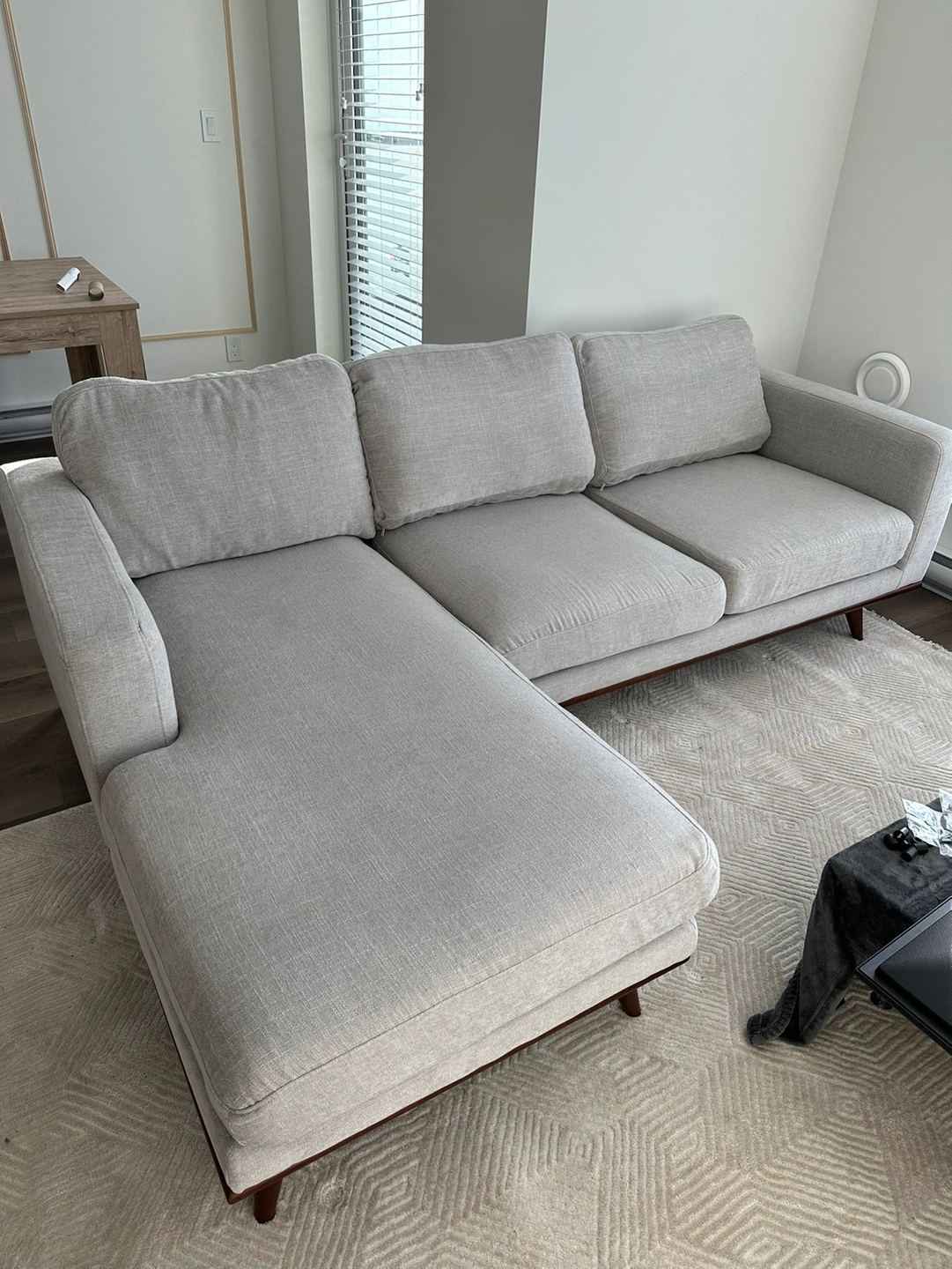 22Light heather grey R sided sectional with walnut wooden legs, from Q living furniture. Comfortably seats 2-3 people, the chaise is non-reversible. Sits a little lower than most couches. Some pilling can be seen but fabric shaver has worked really well in the past. No stains and the covers are machine washable. Smoke-free, pet-free home! Retails for $2000+tax. We really loved the couch but unfortunately doesn’t work with our new space. It’s very comfortable!! Dimensions: 91inch length 34inch armrest length 56inch chaise (34” armrest + 22” sticking out) 16inch from the floor Works great in a condo!! Pick up in Willoughby Langley, no delivery. Serious buyers only please. More pictures/videos upon request.