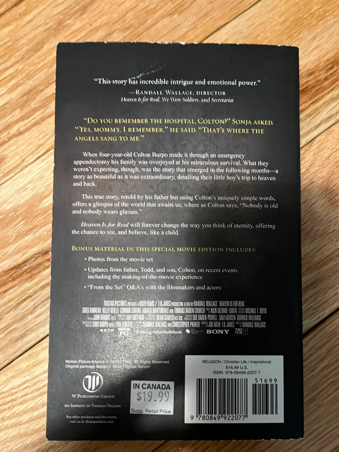 30Selling "Heaven is for Real" by Todd Burpo, a New York Times Bestseller! It's the special movie edition. This book tells the story of a little boy's trip to heaven and back. Originally priced at $19.99 in Canada. It falls under the Religion/Christian Life/Inspirational category. A great read for anyone interested in this genre