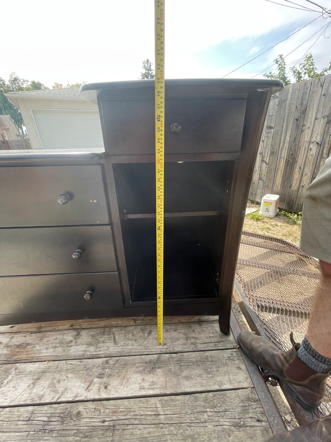 Heavy hardwood Dresser Drawers 4 drawers and 2 cubbies It needs 1-2 very minimal pieces of hardware for the cut board lid to attach , the picture where the hand is gesturing. OR you could Leave the drawer off and use the cubbies as is! MOVING SALE! Must sell! Moving sale! 51.5 ” L. x 21 ” W. x 33 H or 39 ” H. Listed for $275 Reduced to $ 120 cash now $90 Pick up is in east kildonan on Dunrobin Ave Pick up will require a car or a large trunk or an SUV or a truck. We have the table disassembled, someone here can likely help you load. Cash only. No e-transfer. No delivery possible.