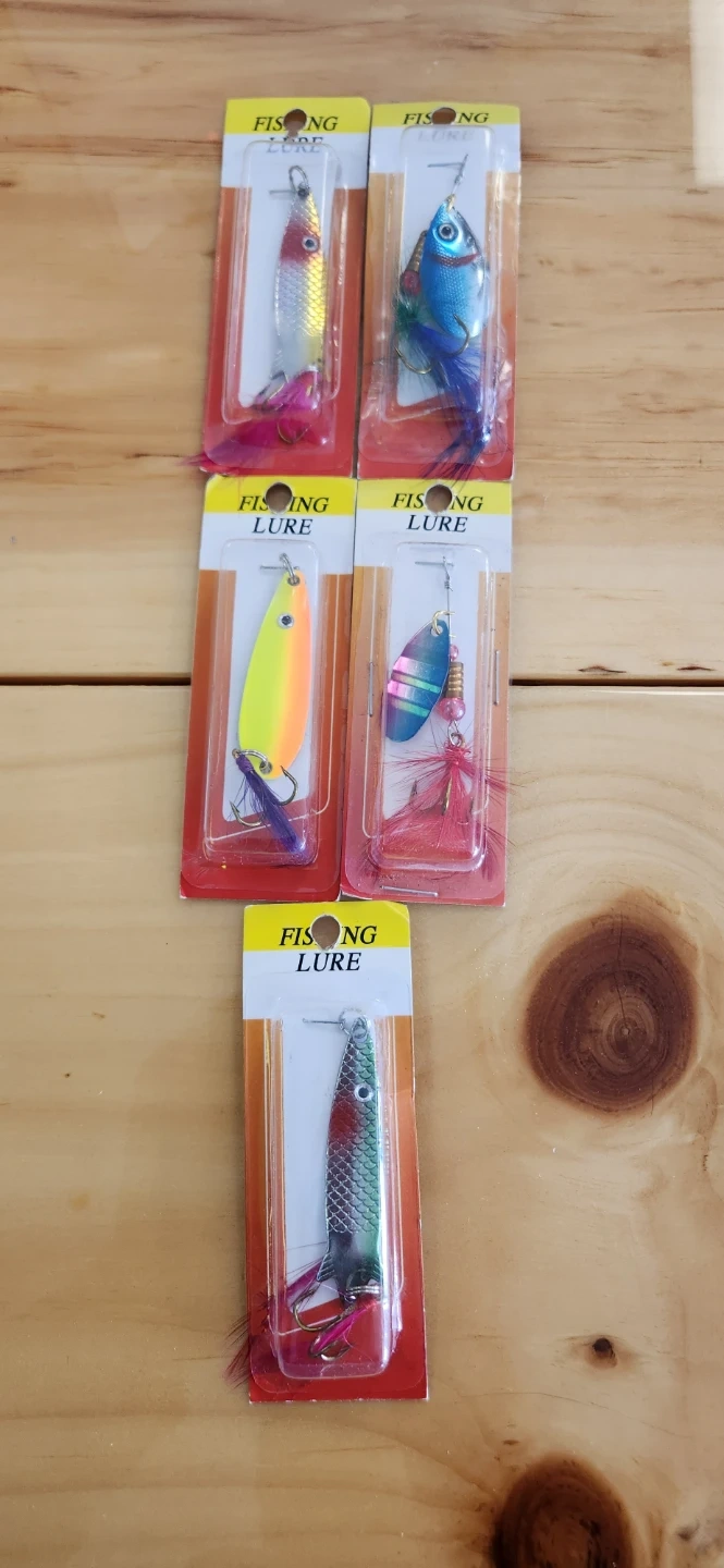 This is a lot of five fishing lures. They come in various colours and styles. They're packaged and ready for use!