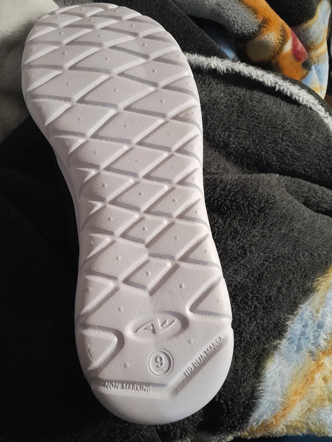 These Athletic Works slip-on shoes are black and feature memory foam insoles. They're made in Cambodia and have a non-marking sole. Size is 9.