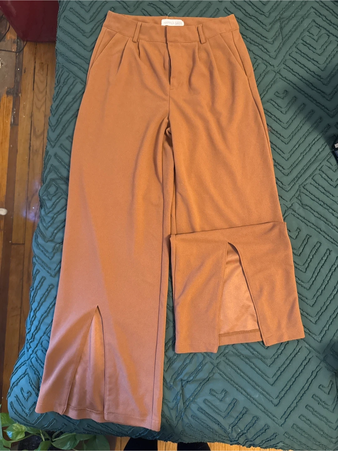 These are a pair of brown pants from Happily Grey! They have a slit at the bottom of each leg. Perfect for a casual or dressy look