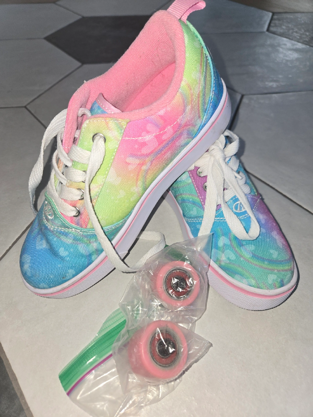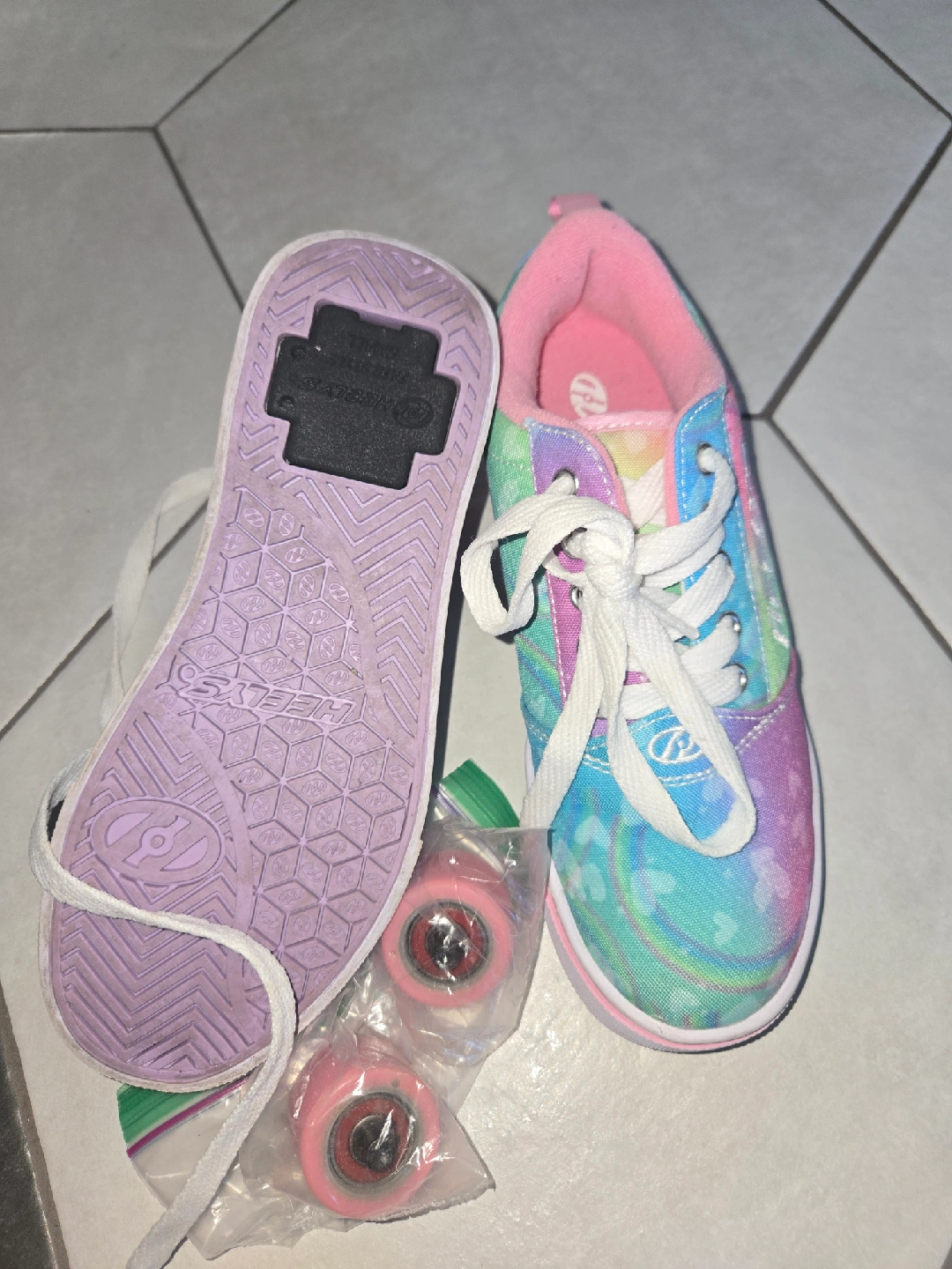 Selling a pair of Heelys roller shoes in a colourful tie-dye pattern! These are in great condition.Perfect for some fun rolling around size youth 3,EU 34, 21cm