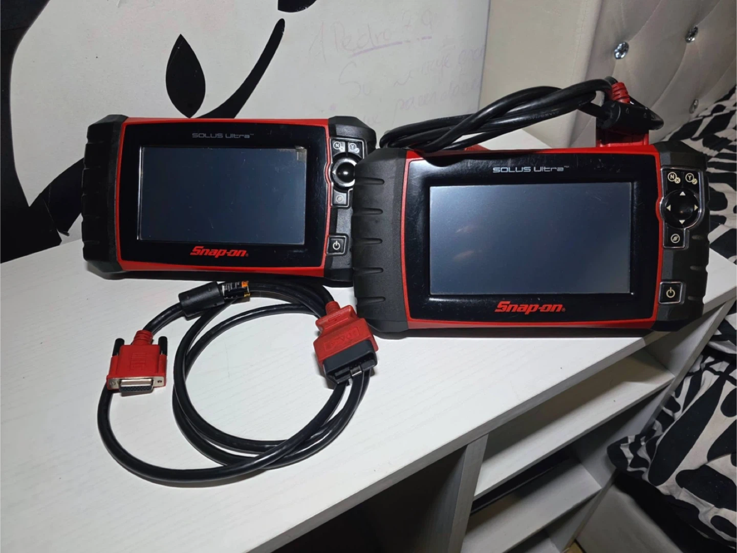 Two Snap-on SOLUS Ultra diagnostic scan tools. Includes cables for connection. These are professional automotive diagnostic things from your or mine card faces.