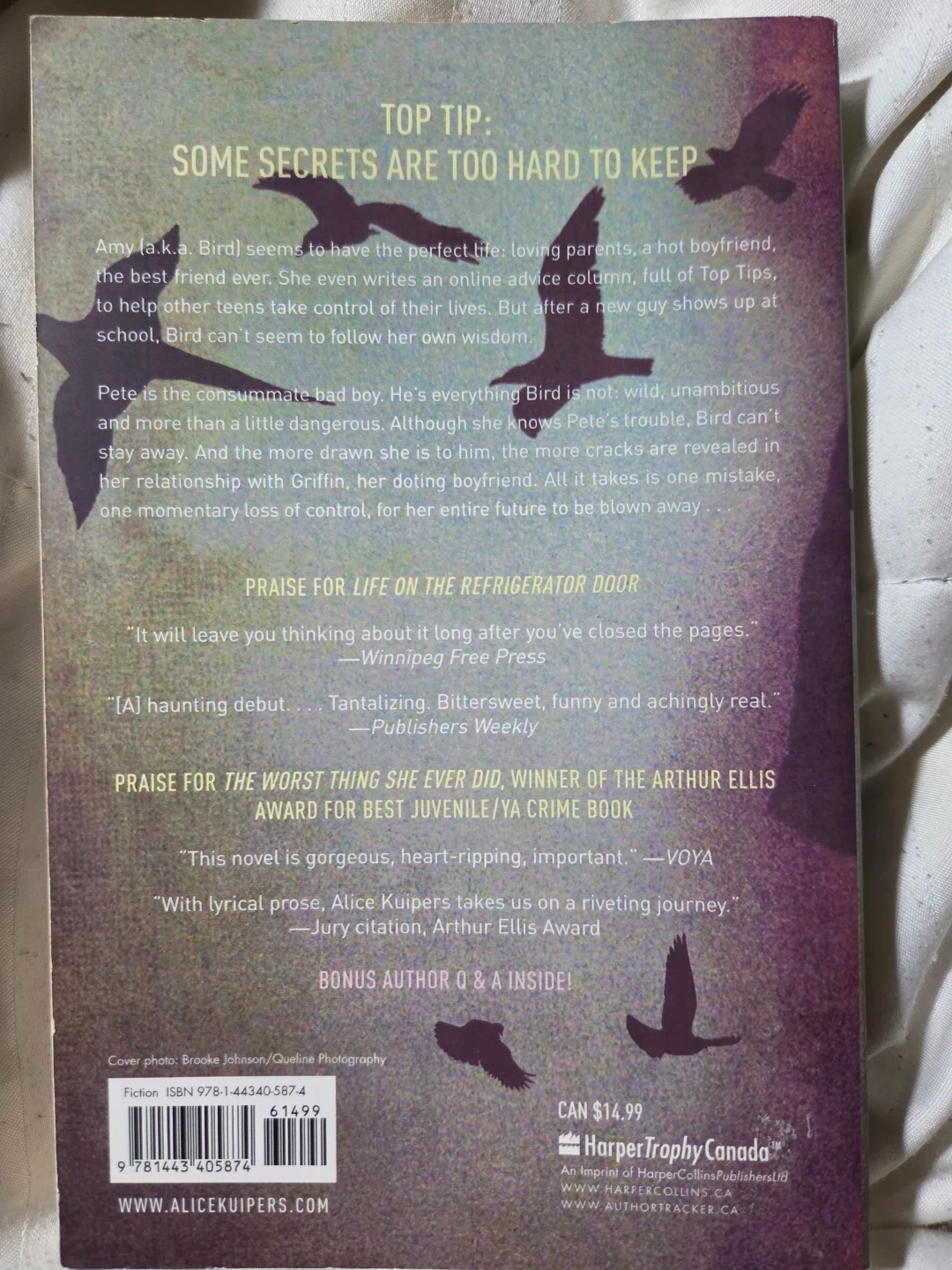 This is the young adult novel '40 Things I Want to Tell You' by Alice Kuipers. It's a captivating story about secrets and relationships. The book is published by Harper Trophy Canada.