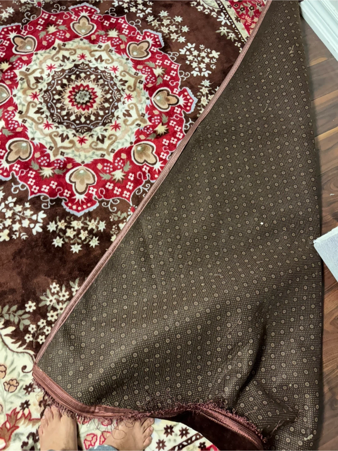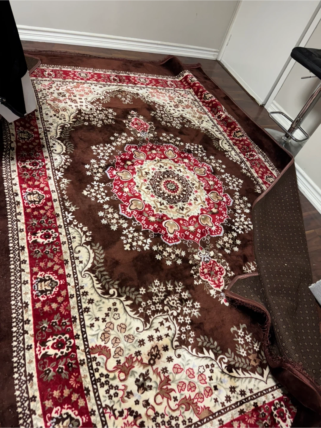 Beautiful area rug featuring a rich brown base with a vibrant red floral medallion design. It's got a non-slip backing for added stability. This rug's pattern will add a touch of elegance to any room. There is rip on one side can be easily fix with hand sewing, machine washable