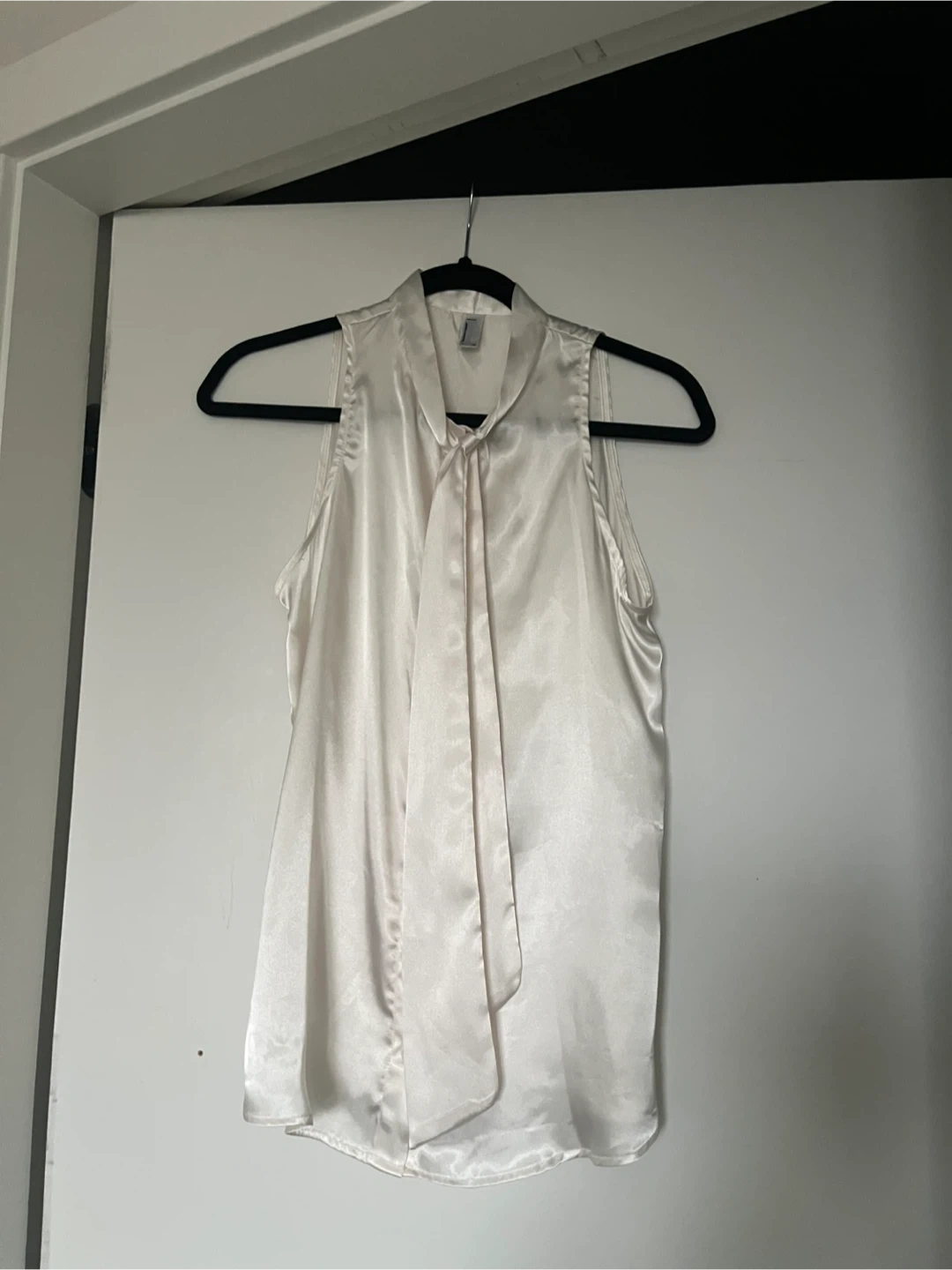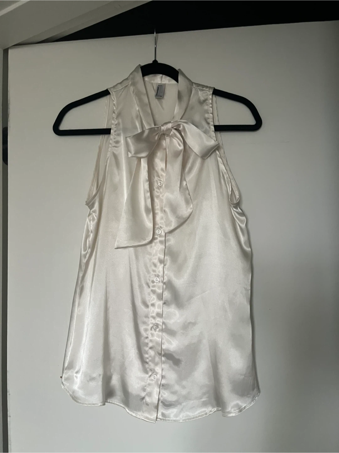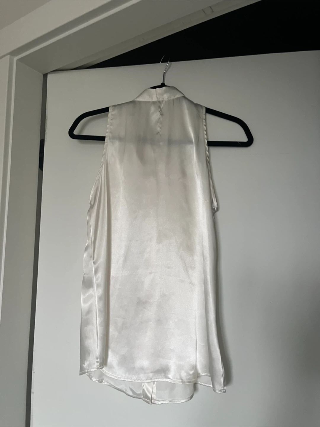 This sleeveless satin blouse features a tie-neck detail and button-up front. Made in the USA. Material is satin-like. Size XS.