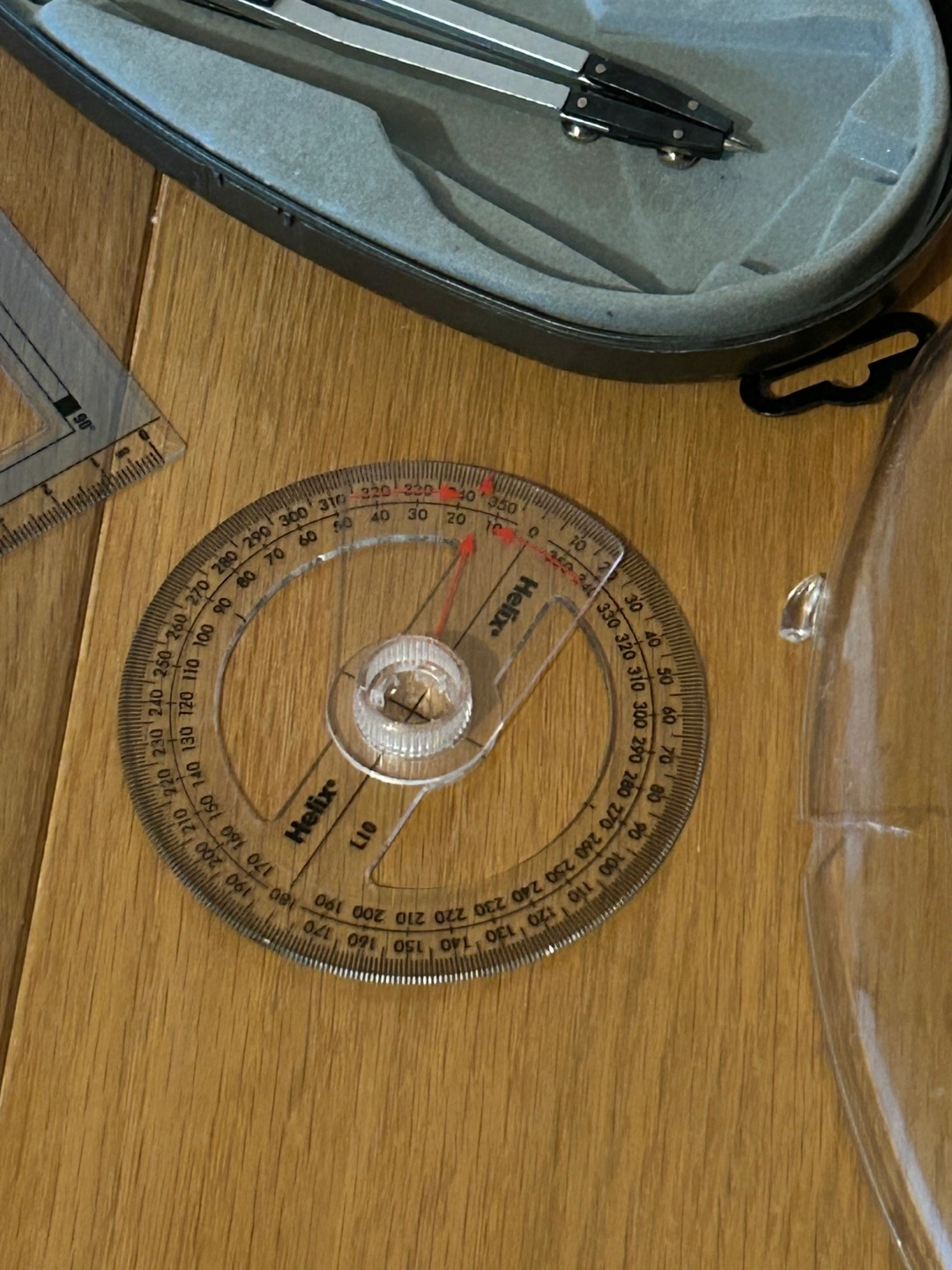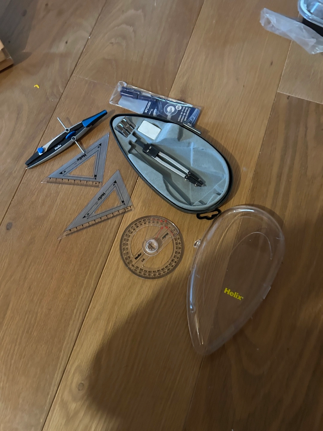 Complete geometry set. Includes compass, protractor, two set squares, and pencil. All in a protective case.