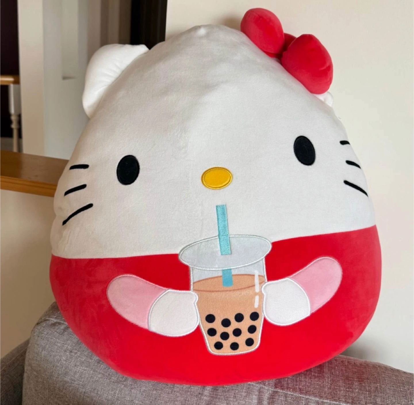 23Hello Kitty SQUISHMALLOW! 20" tall. Featuring a red bow and a bobo tea. A wonderful addition to your relaxation.