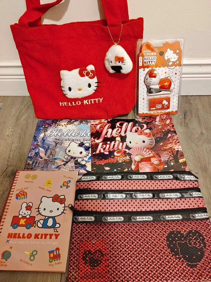 33Hello Kitty Coloring Books and Stationeries includes - (2) coloring books (maybe for older kids or adults as the pictures are more detailed - (1) lined pink notebook - (1) pouch - (1) red corduroy bag - (1) kitty onigiri rice ball charm - (1) kitty stapler Great as stocking stuffer :) Pick up at Killarney Community Center or nearby 6260 Killarney St, Vancouver, BC V5S 2X7 Thank you for your interest ~