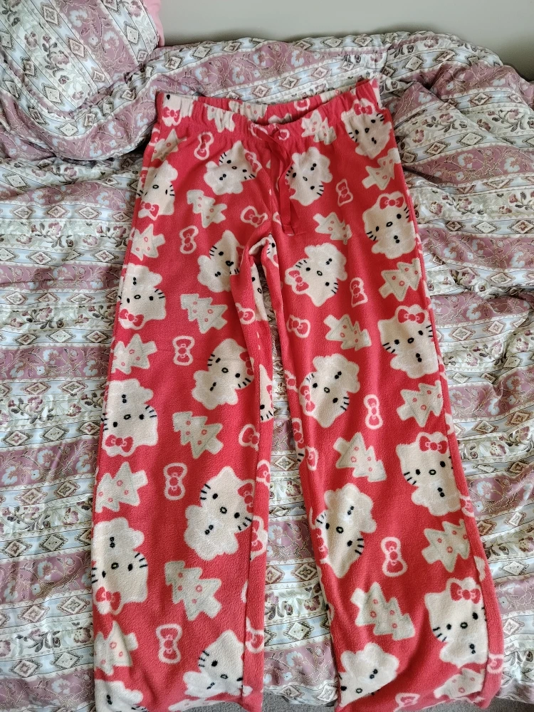 0Brand new. They feature a fun all-over print with Hello Kitty and Christmas trees on a soft, red fleece material.
