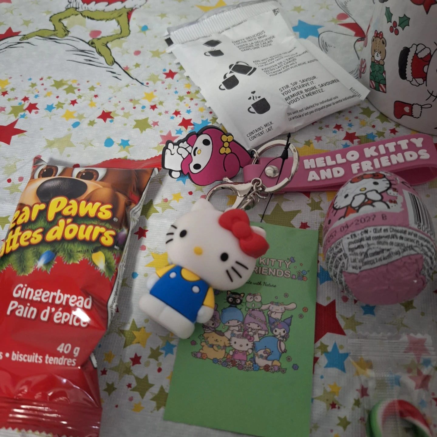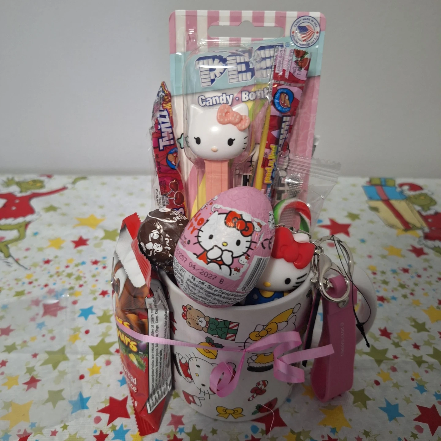34Selling a cute Hello Kitty themed holiday gift mug filled with assorted candies and treats! The mug features Hello Kitty and friends in festive holiday designs. It's perfect for a Hello Kitty fan or as a sweet holiday gift
