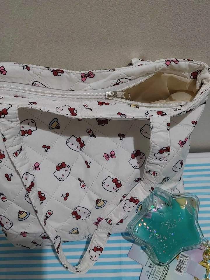 25Kitty White Shoulder Bag - 11.5 inches wide on the bottom and 11 inches in height - can fit a phone and cosmetic bag etc.. Includes a decorative large Tsunameez pendant with 2 floating kitties inside. Thanks!