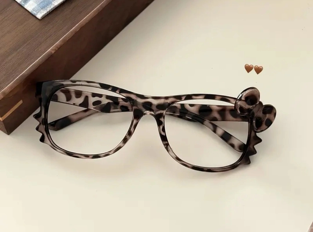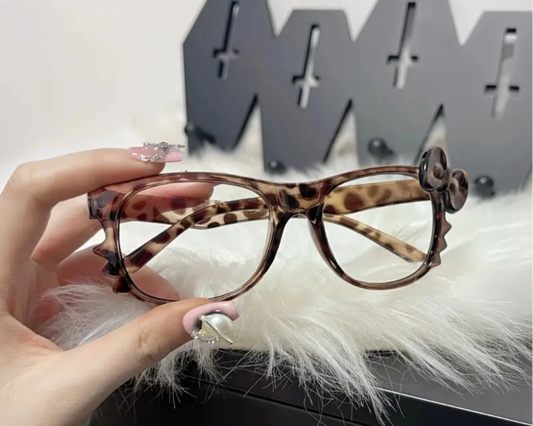 Check out these adorable Hello Kitty glasses! They feature a cute leopard print design and Hello Kitty bow detail on the side. Perfect for adding a touch of fun to your everyday look