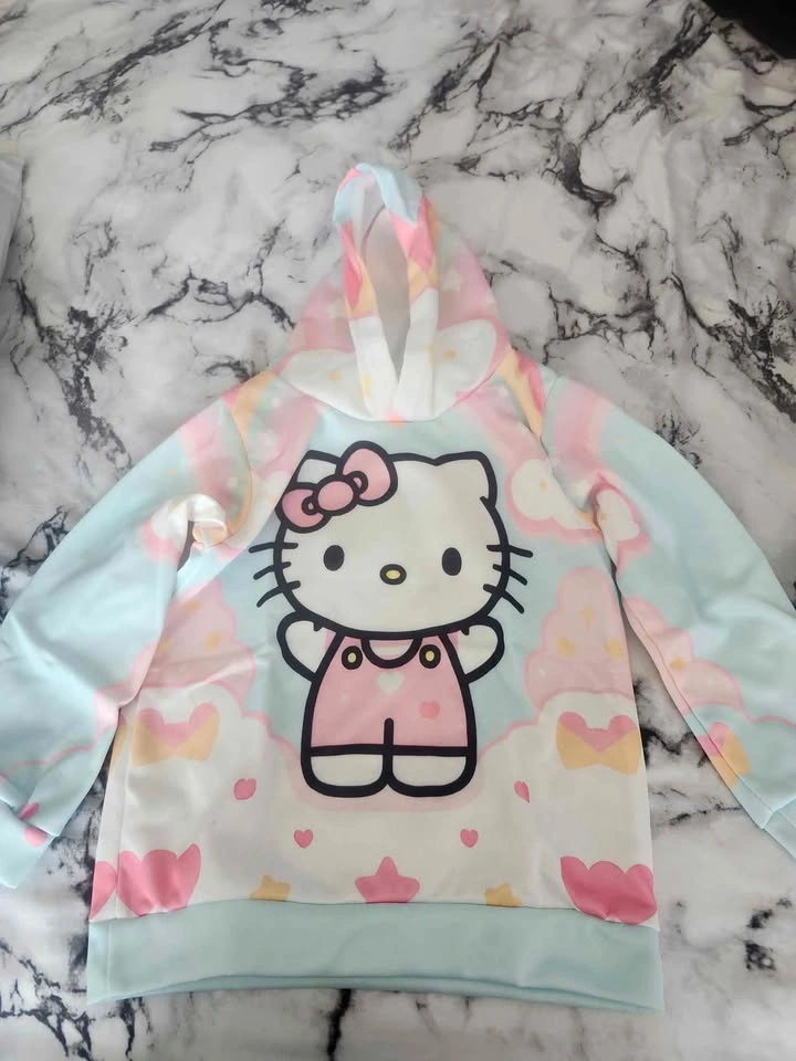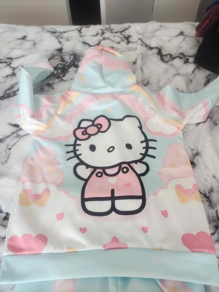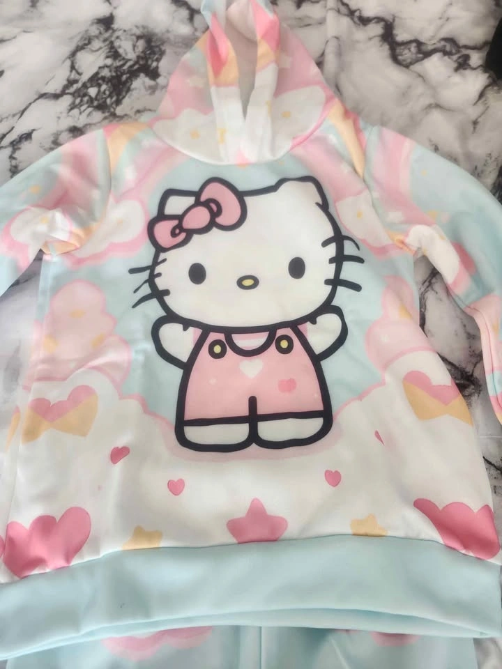 122Super cute 2-piece Hello Kitty outfit your little one will adore! π β¨ Light blue with colorful rainbow cloud Hello Kitty design β¨ Soft fleece lining inside for extra warmth and coziness β¨ Cozy hooded sweatshirt + comfy elastic-waist pants β¨ Great for school, lounging, or running errands β¨ Perfect gift for any Hello Kitty fan! π§ Size: 5β6 Years π° Price: $10 β Great deal! π‘ Smoke-free & pet-free home