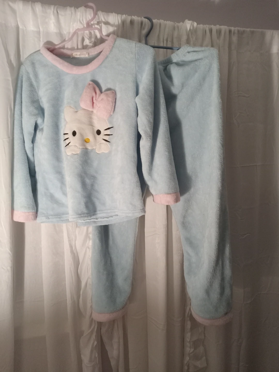 10Super cute Hello Kitty pajama set! It's a soft, fuzzy material, perfect for cozy nights. The set is light blue with pink trim and features an adorable Hello Kitty design on the top xl kids size 12-14