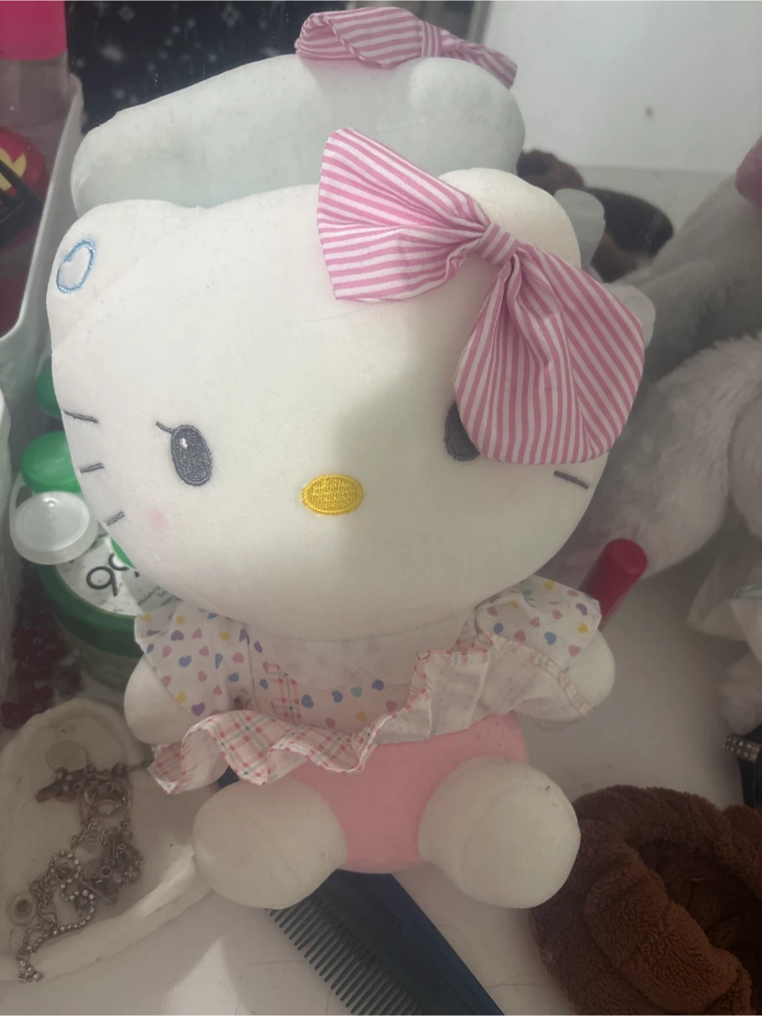 25A cute Hello Kitty plush toy with a pink striped bow and a frilly dress! It's in great condition and ready for a new home