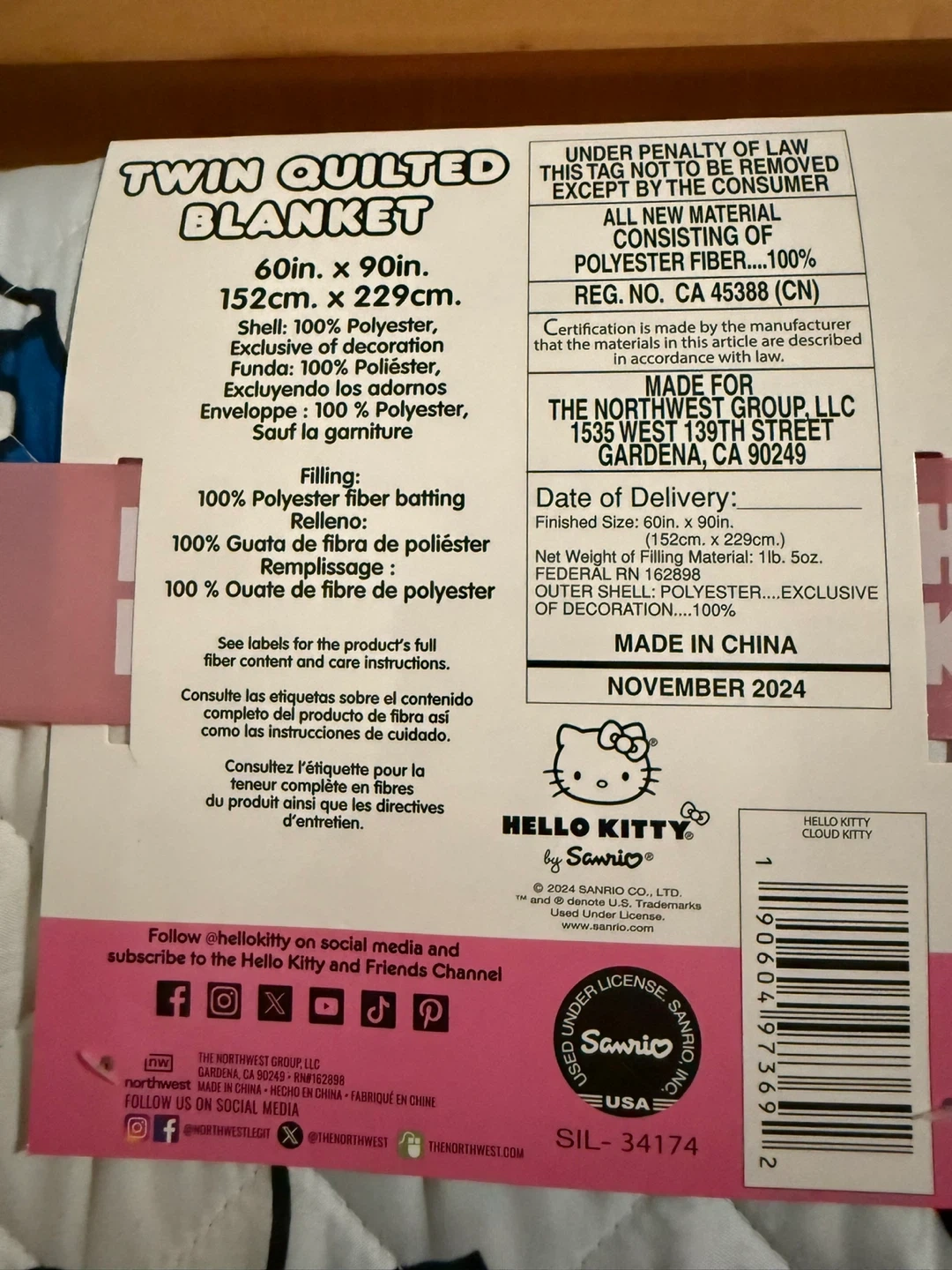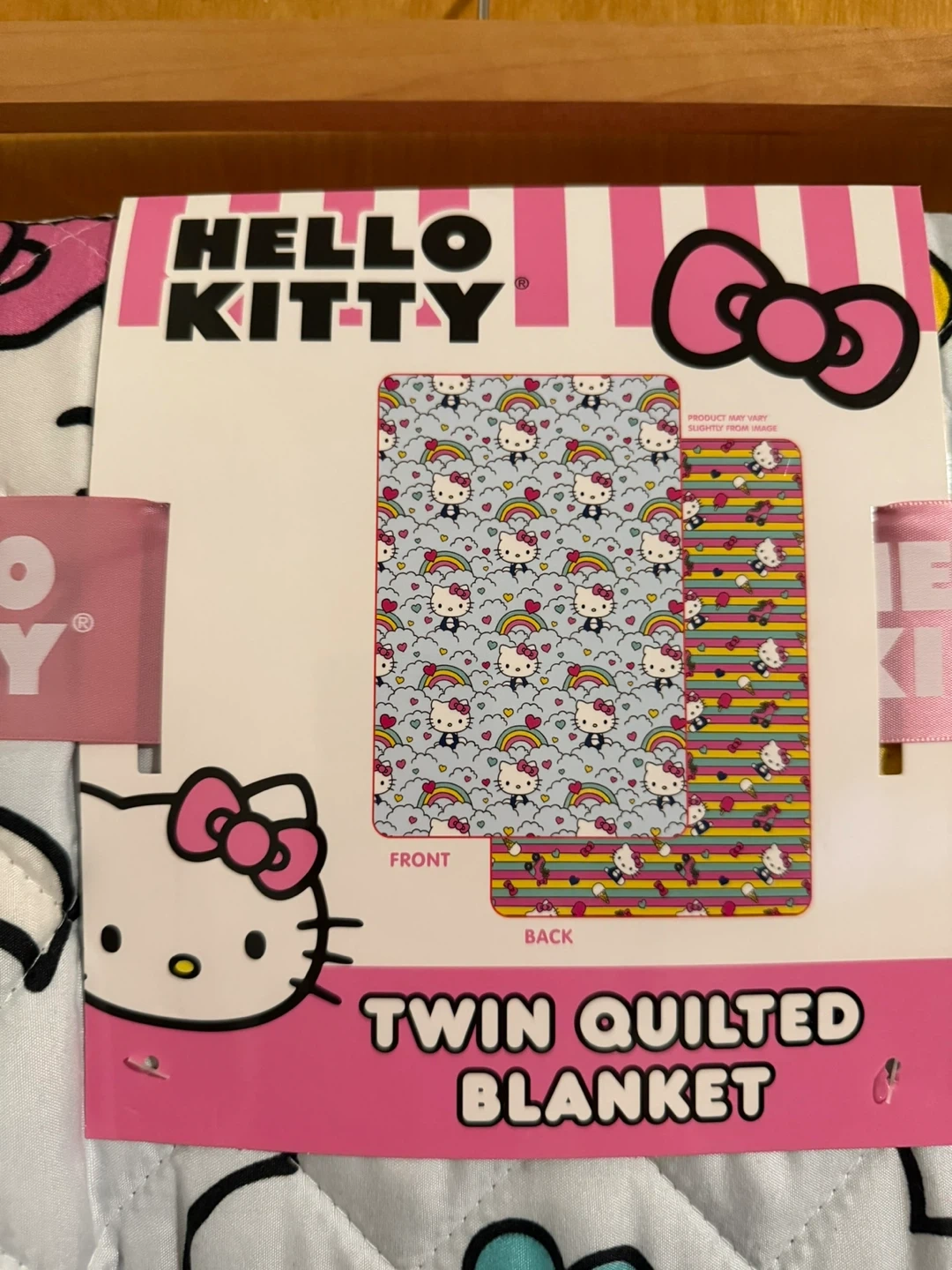 I'm selling a brand new Hello Kitty twin quilted blanket! It's still in its original packaging. The blanket is 60in x 90in (152cm x 229cm) and made of 100% polyester.