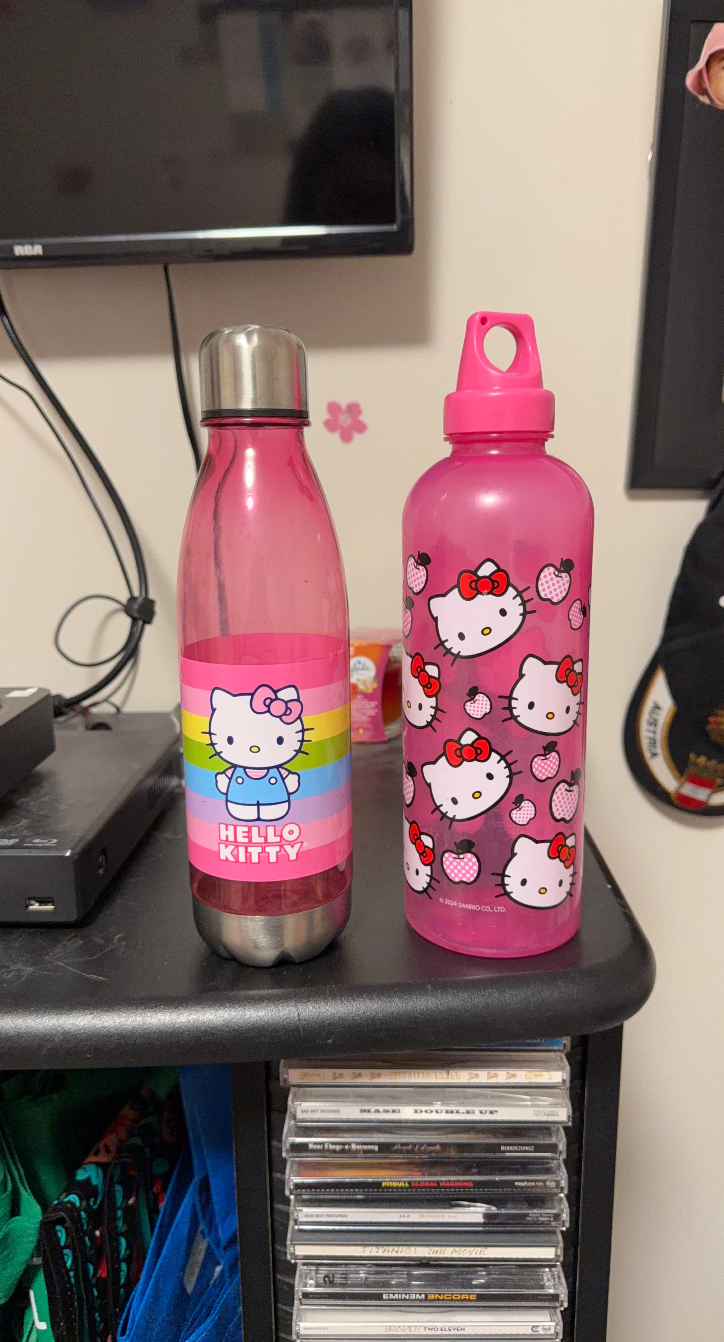 91Selling a set of two Hello Kitty water bottles! One is pink with a stainless steel top and Hello Kitty on a rainbow background. The other is also pink and covered in Hello Kitty faces and little apples. Both are in great shape and ready for a new home!