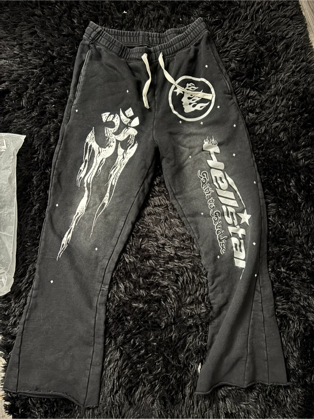 17Selling a pair of Hellstar black sweatpants in size medium. They feature a unique design and are in great condition! Perfect for adding some edge to your wardrobe
