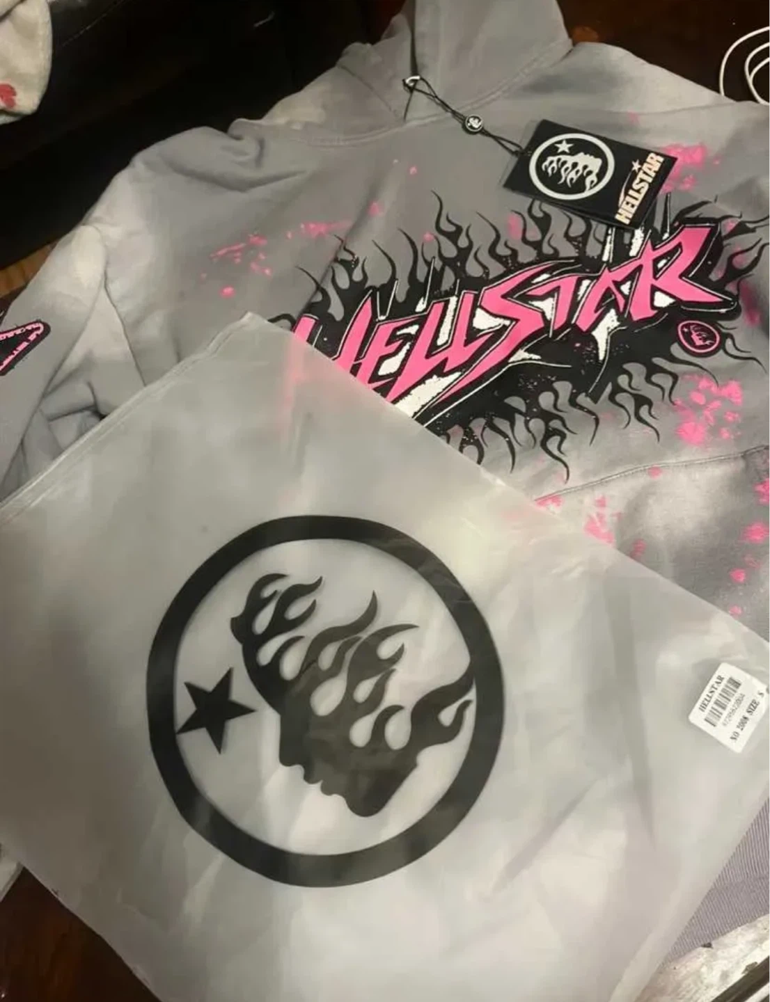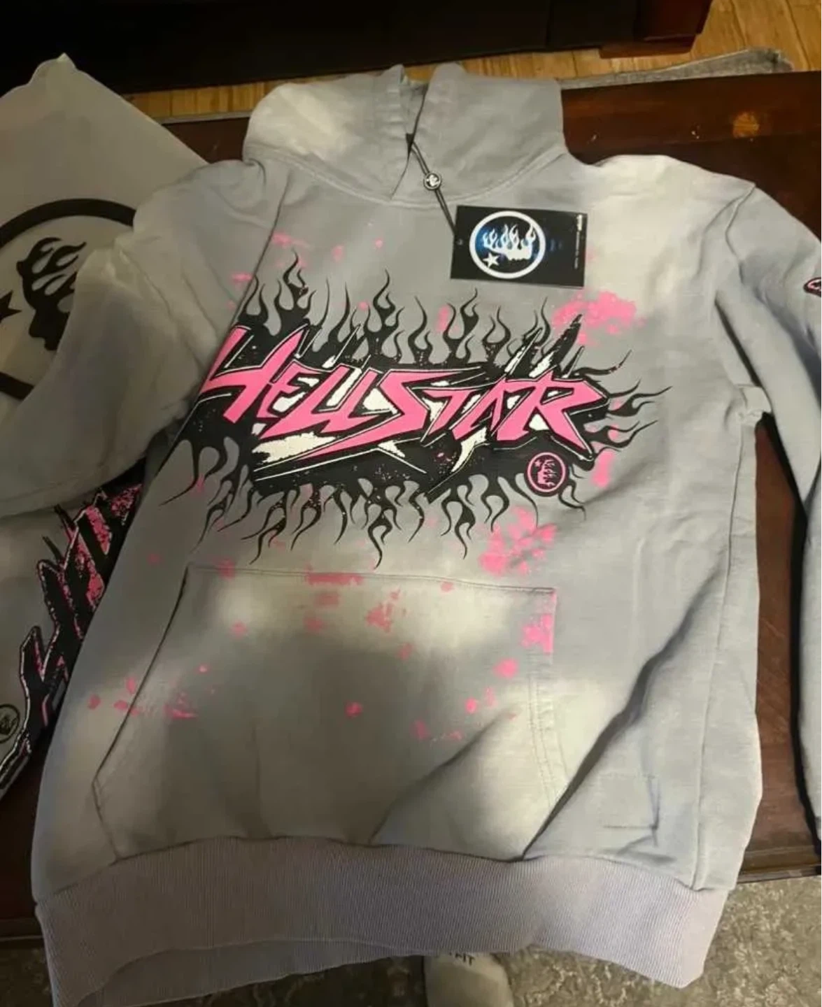 Selling a Hellstar hoodie in grey with pink flame graphics. It's a size medium and comes in the original packaging! Btw have all color ways and all sizes lmk taking preorders