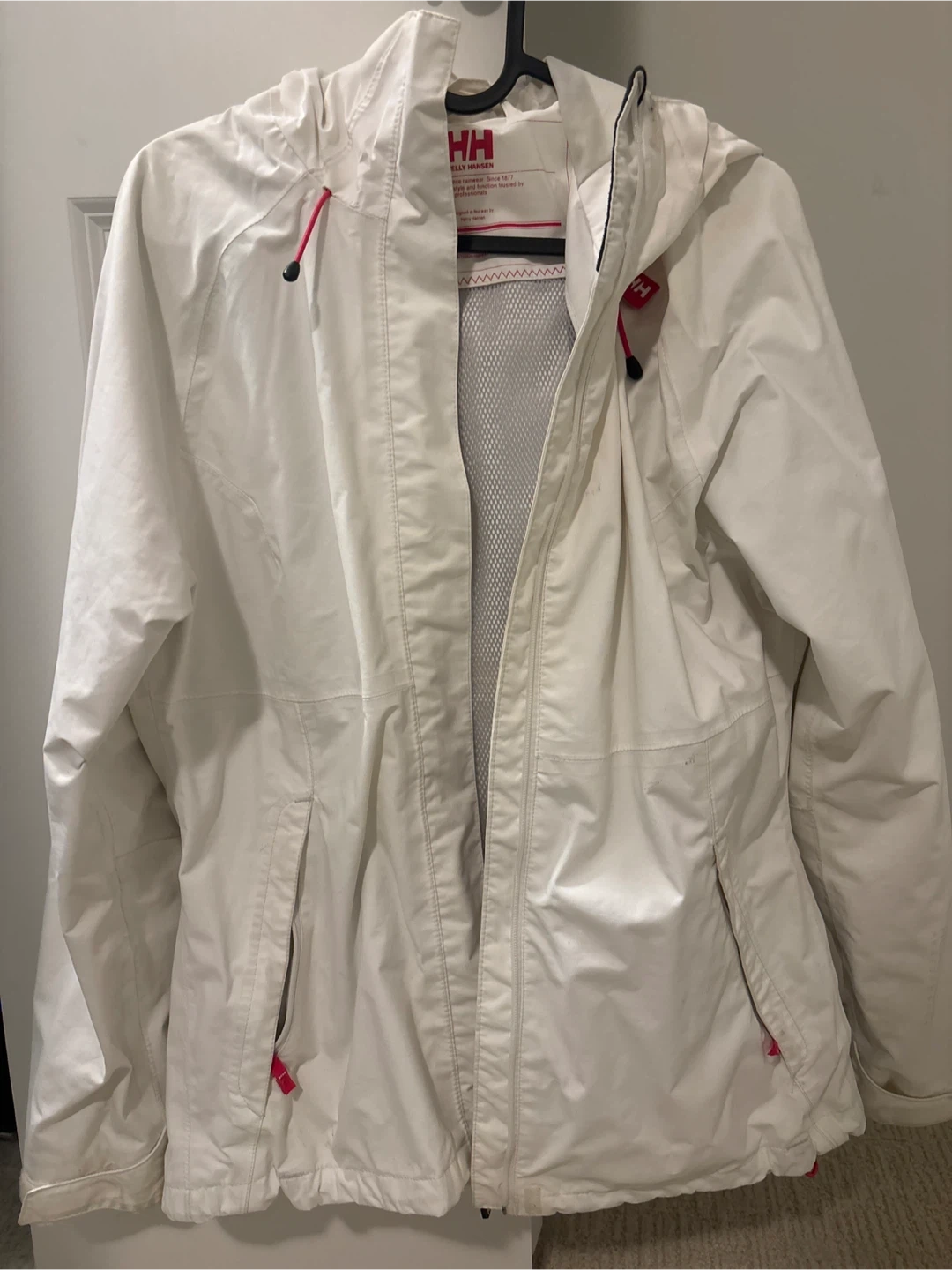 32Selling a Helly Hansen rain jacket in size L. It's in great condition, and fits more like a medium. The jacket is white with red accents and features a hood. It's lightweight and comfortable, ideal for outdoor activities
