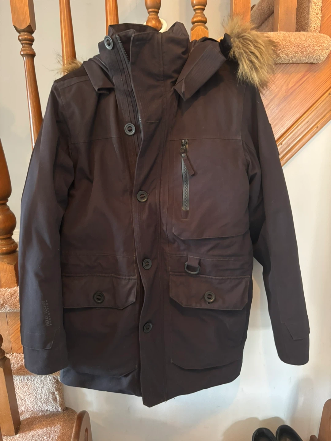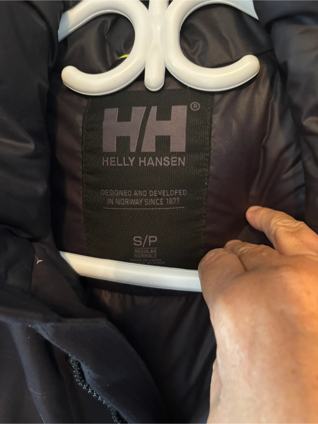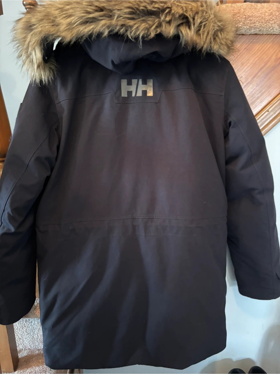 115Helly Hansen winter jacket, size small. It's a great jacket for cold weather with wind chill protection. The shell is 100% polyamide, and the lining is 100% polyurethane. The insulation is 60% duck down and 40% duck feather. The fur trim is 85% acrylic and 15% polyester Minimal signs of wear Men’s small