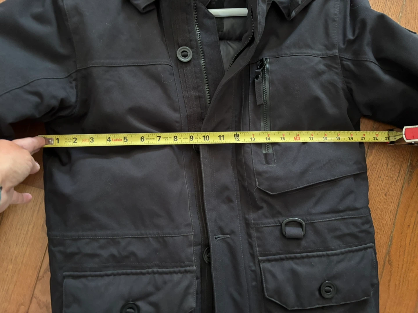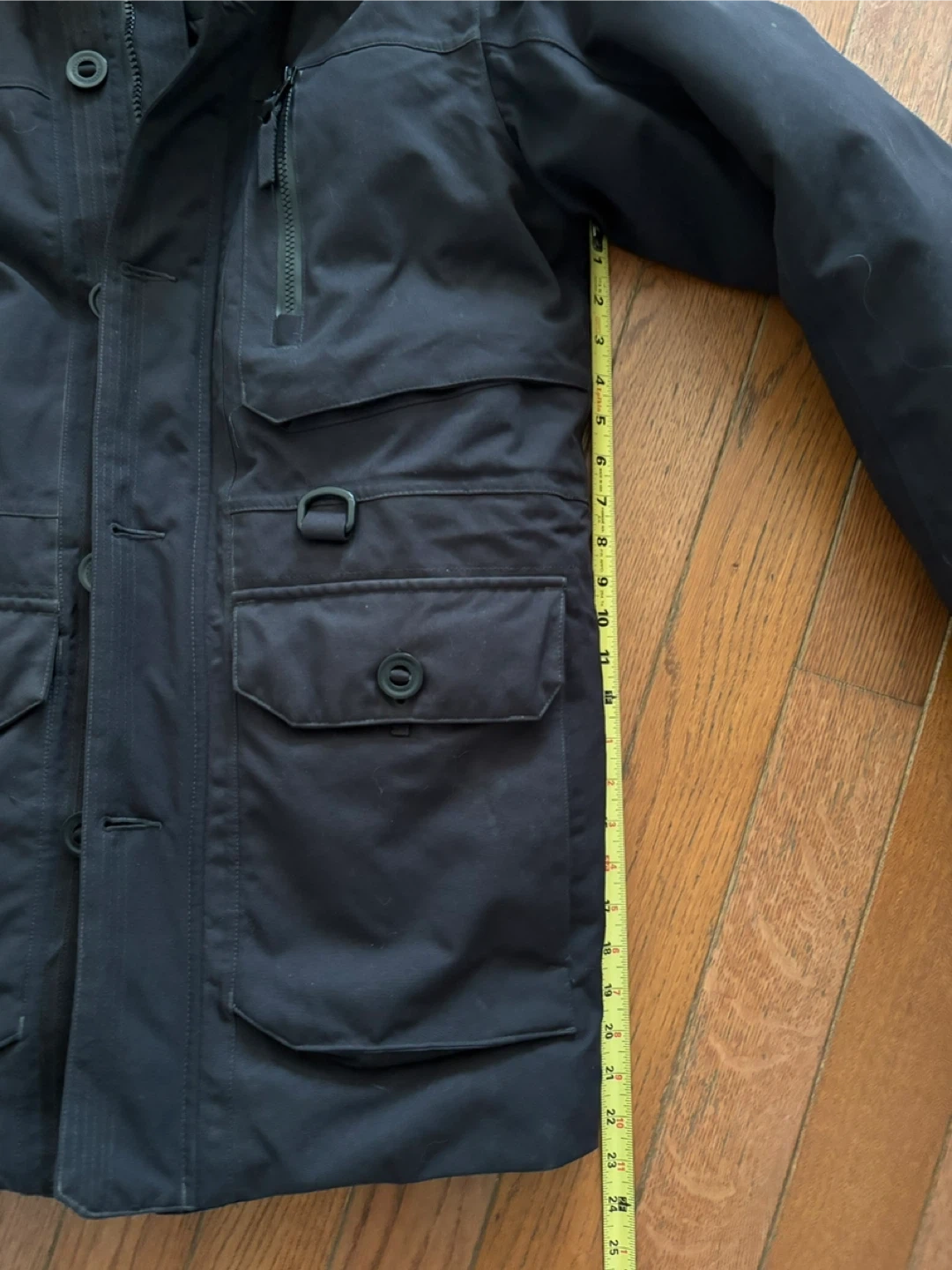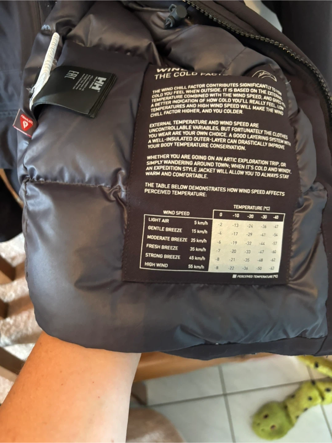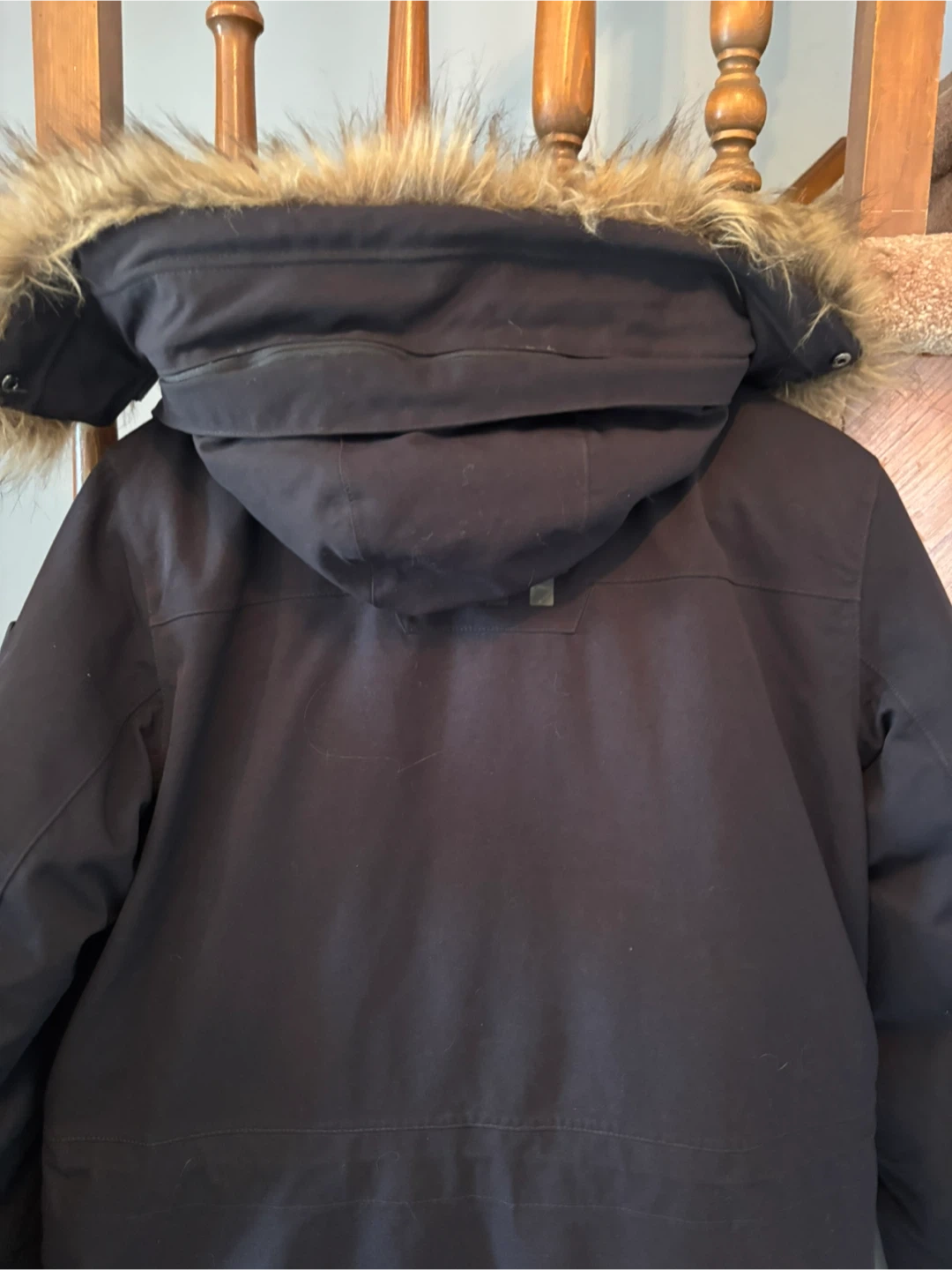 115Helly Hansen winter jacket, size small. It's a great jacket for cold weather with wind chill protection. The shell is 100% polyamide, and the lining is 100% polyurethane. The insulation is 60% duck down and 40% duck feather. The fur trim is 85% acrylic and 15% polyester Minimal signs of wear Men’s small