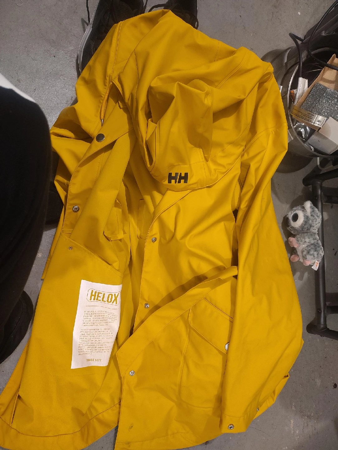 Selling a Helly Hansen raincoat in bright yellow! It's a size L/G and in great condition. The material is Helox, designed to keep you dry and comfortable in wet weather. Perfect for those rainy days!