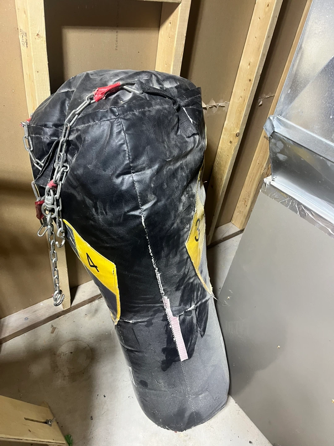 This is an Everlast punching bag. It's made of durable black material and comes with heavy-duty chains for hanging. Perfect for your home gym setup!