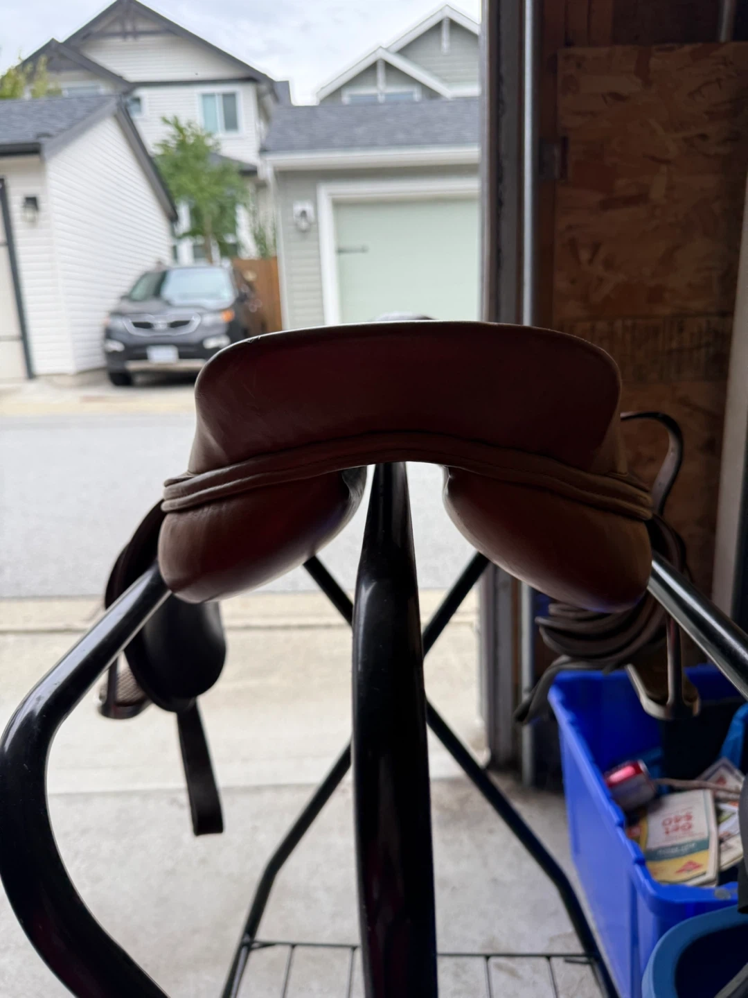 Selling a used Henri de Rivel saddle. It's a beautiful brown leather and is in great condition. Perfect for any equestrian enthusiast! It was my starter saddle and took me on many adventures with my horse. Very comfortable saddle! Size: 16.5” with a medium gullet. Just wear and tear on it. Comes with saddle rack, girth, stirrups, martingale and saddle cover.